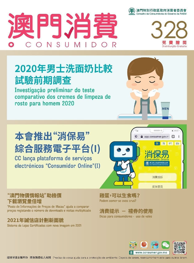 Esta edição publica ainda textos sobre as funções de comparação de preços do “Posto de Informações de Preços de Macau” e o consumo dos ovos. A revista “O Consumidor” n.º 328 encontra-se agora disponível na página electrónica do CC (www.consumer.gov.mo) e na sua conta de WeChat.