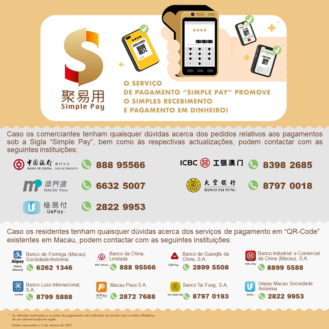 Com efeito, o serviço de pagamento agregado “Simple Pay” constitui uma iniciativa que tem por finalidade promover a cooperação dos bancos e das instituições de pagamento que facultam os serviços de pagamento em “QR Code” locais, bem como a interligação e interconexão dos seus sistemas de pagamento. Aliás, na primeira fase, mediante a actualização dos terminais actualmente existentes, os comerciantes podem aceitar todos os meios de pagamento locais e apresentados neste formato, sendo que os terminais continuam a aceitar outras formas de pagamento presentemente aceites, como por exemplo, os cartões de crédito, o pagamento de indução NFC, as carteiras electrónicas do exterior detidas pelos turistas. Assim, verifica-se a introdução de uma nova funcionalidade que permite a identificação automática dos diversos meios de pagamento existentes em Macau e apresentados em “QR code” em virtude da actualização dos respectivos aparelhos, mantendo-se inalteradas as operações anteriormente adoptadas.