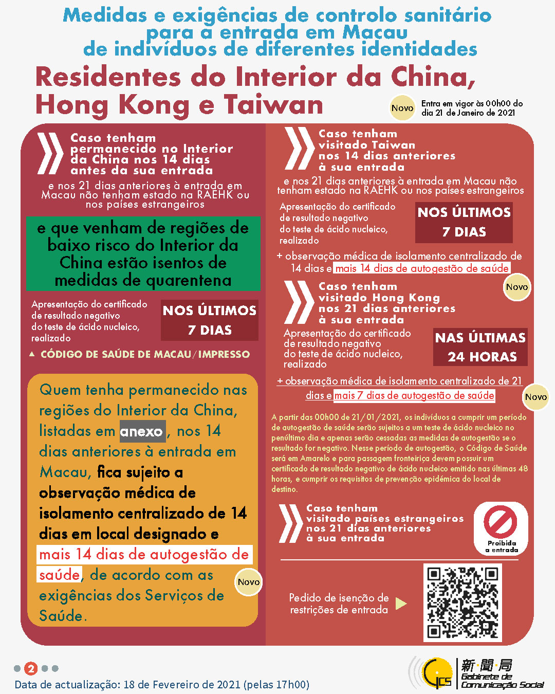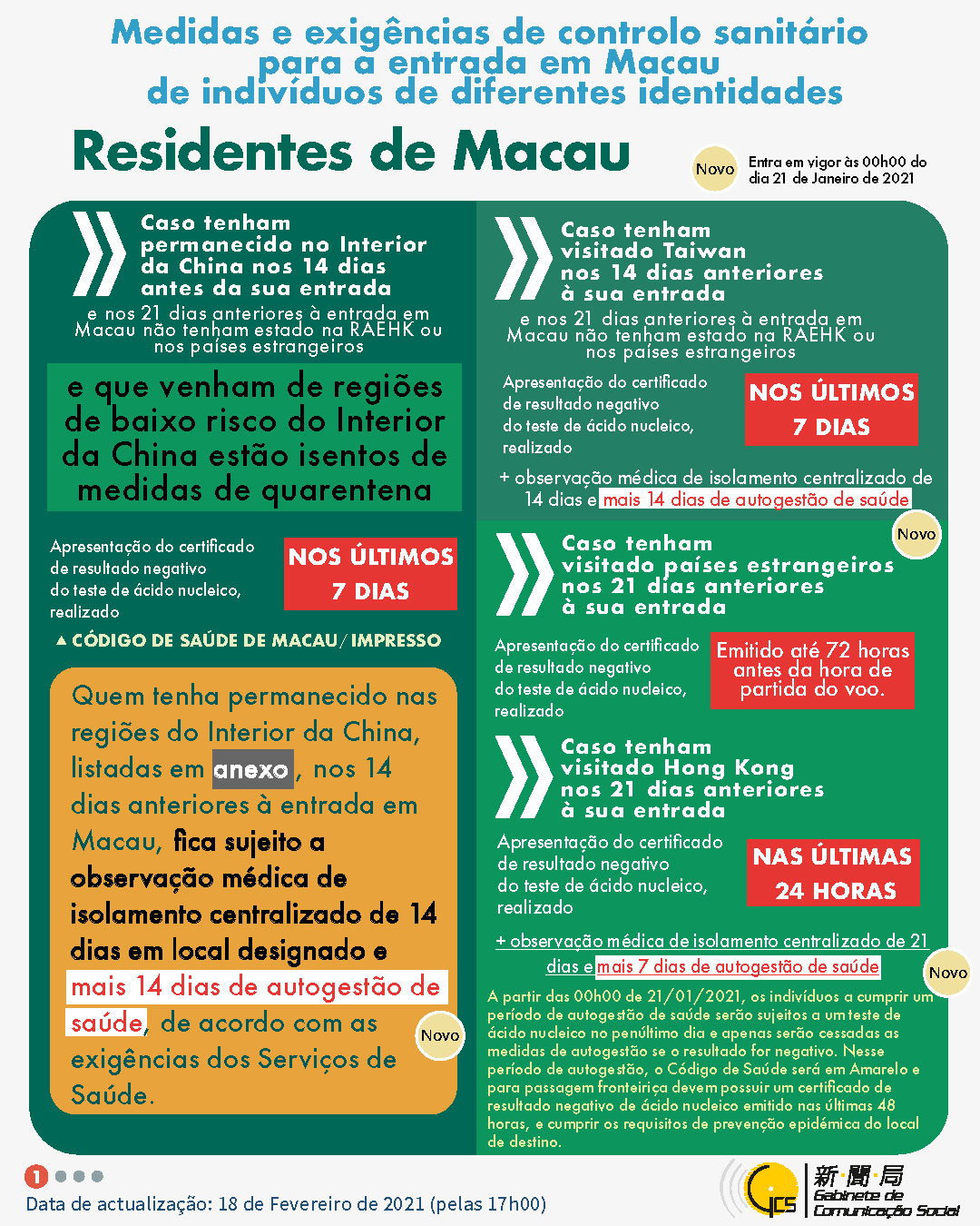 (Infografia) Medidas e exigências de controlo sanitário para a entrada em Macau de indivíduos de diferentes identidades, actualizadas no dia 18 de Fevereiro de 2021