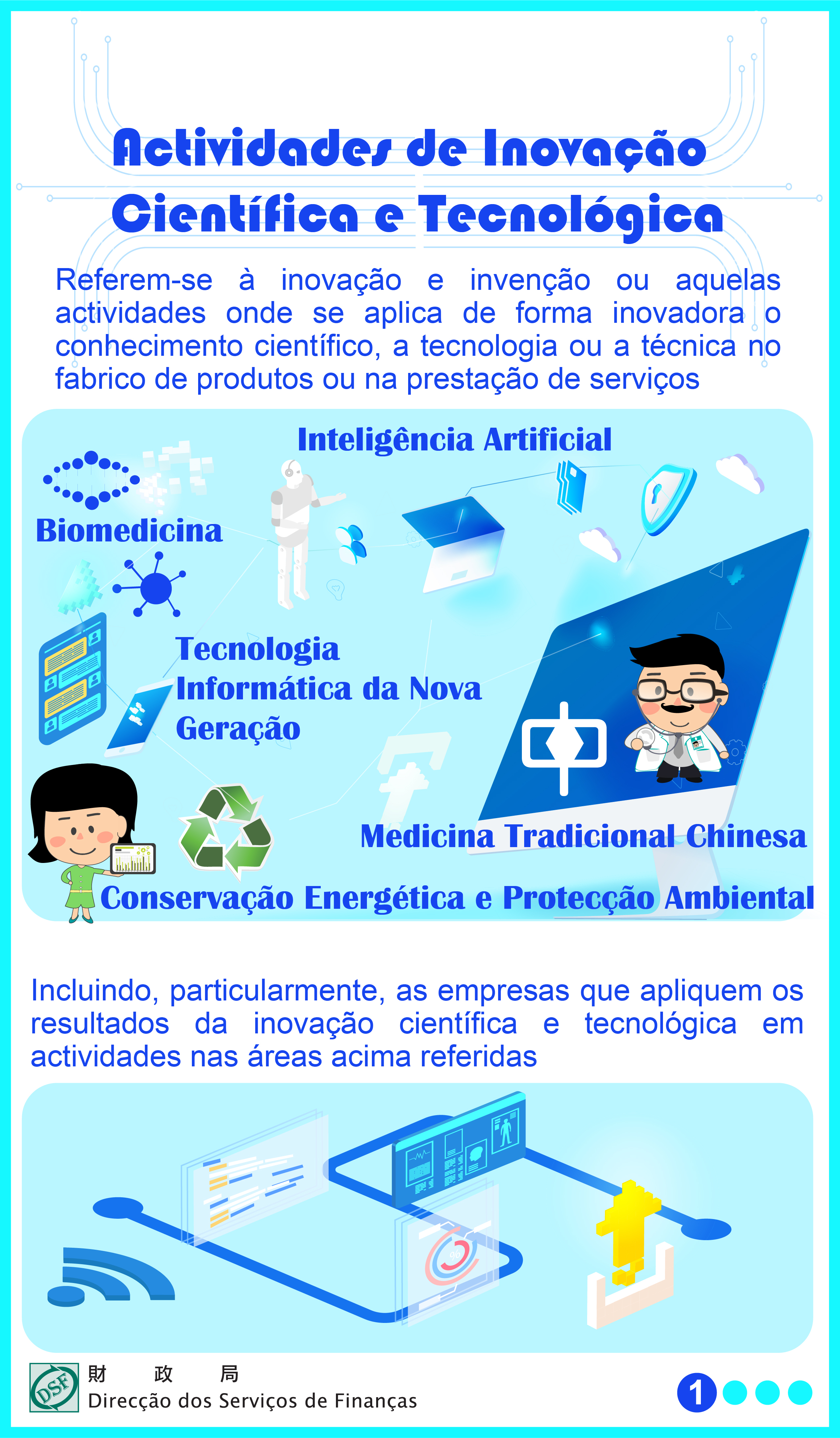 Nos termos da lei, entende-se por “actividades de inovação científica e tecnológica” a inovação e invenção ou aquelas actividades onde se aplica de forma inovadora o conhecimento científico, a tecnologia ou a técnica no fabrico de produtos ou na prestação de serviços, nomeadamente, a aplicação dos resultados da inovação científica e tecnológica em áreas como a tecnologia informática da nova geração, a inteligência artificial, os circuitos integrados, a biomedicina, a medicina tradicional chinesa, a conservação energética e protecção ambiental, a engenharia marinha, a nutrição, as novas energias, a aeronáutica e a astronáutica, bem como a inovação e invenção nessas áreas.