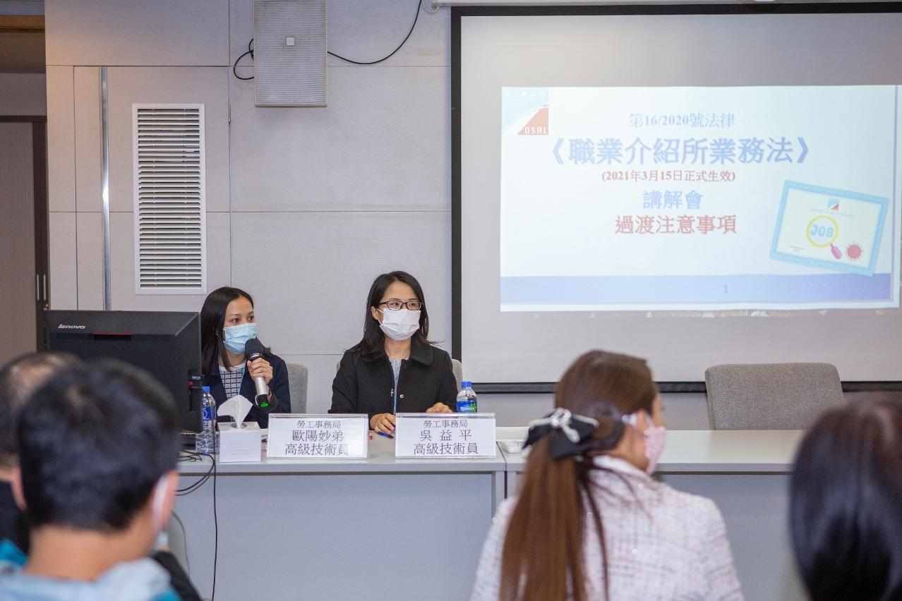 Durante as sessões de esclarecimento, o pessoal da DSAL efectuou esclarecimentos sobre os deveres a cumprir pelas agências de emprego durante o período de transição, aspectos a ter em conta, disposições sobre o estabelecimento de filiais e trâmites para o requerimento da licença de orientador no serviço de emprego, ao mesmo tempo que proporcionou diversos modelos dos formulários em questão, a fim de dar apoio para que uma transição operacional se processe sem qualquer ruptura, e em conformidade com a nova lei. Estas últimas três sessões de esclarecimento contaram com a participação de cerca de 140 profissionais dos sectores, e in loco, o pessoal dos sectores e da DSAL encetaram com entusiasmo um intercâmbio interactivo, partilhando e trocando ideias sobre a prática operacional, criando uma atmosfera dinâmica.