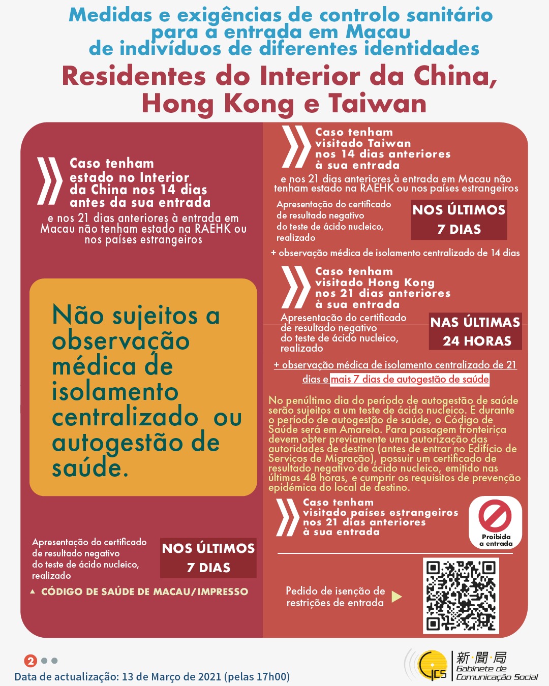 (Infografia)Medidas e exigências de controlo sanitário para a entrada em Macau de indivíduos de diferentes identidades, actualizadas no dia 14 de Março de 2021