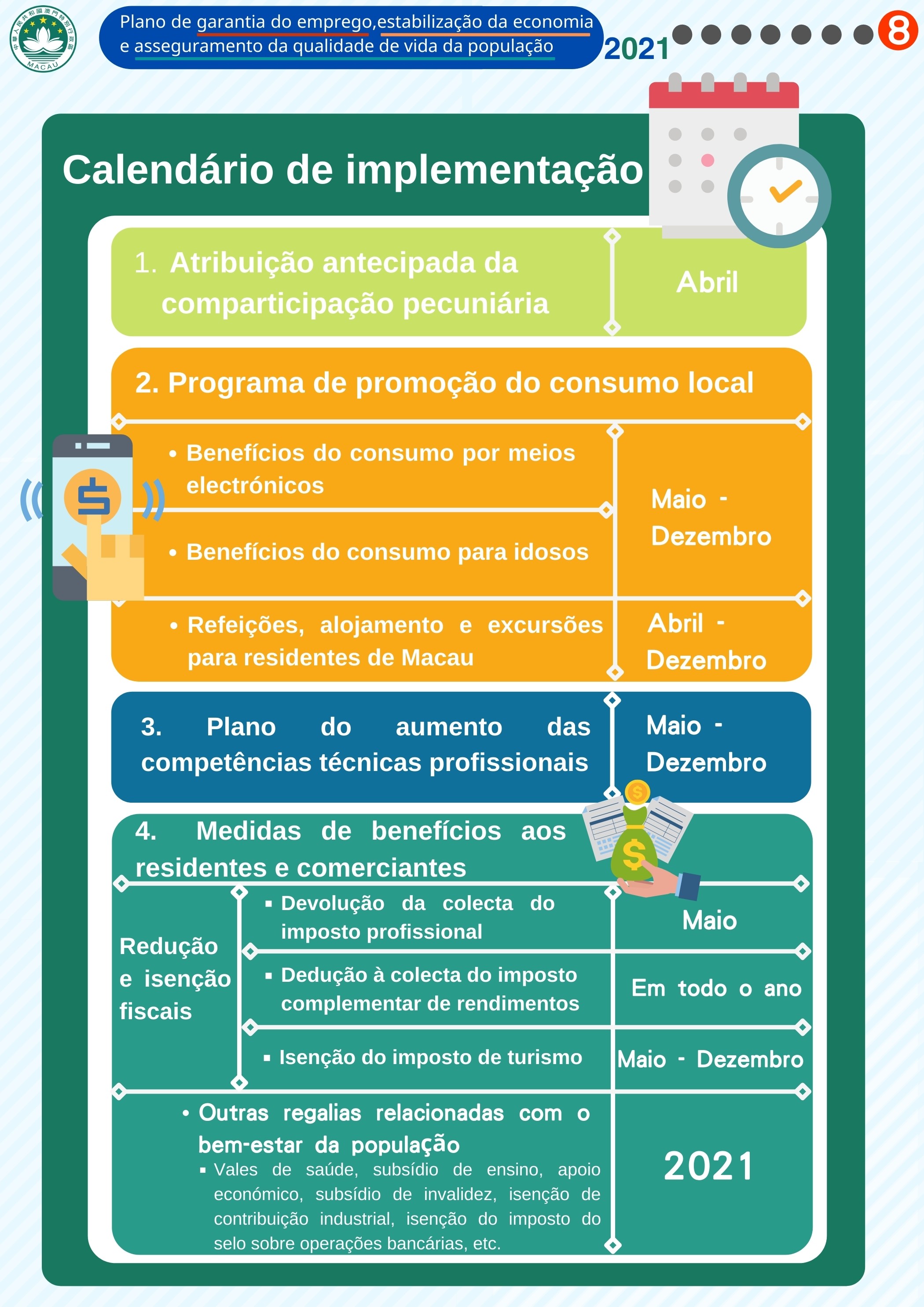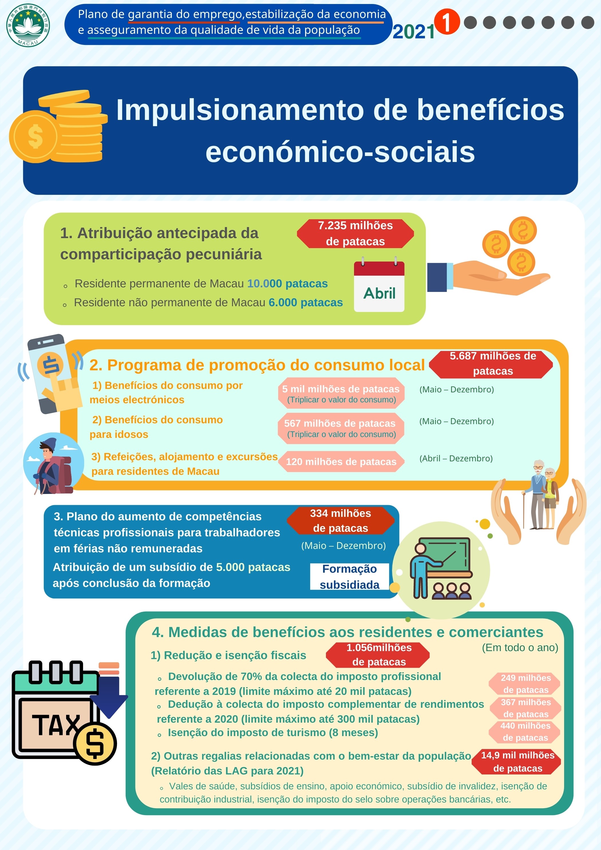 O Plano visa proporcionar benefícios em diferentes vertentes, e será implementado ordenadamente a partir de Abril: I. Atribuição antecipada da comparticipação pecuniária; II. Programa de promoção do consumo local (“Benefícios do consumo por meios electrónicos”, “Benefícios do consumo para idosos” e “Refeições, alojamento e excursões para residentes de Macau”); III. Aumento das competências técnicas profissionais; IV. Medidas de benefícios aos residentes e comerciantes (redução e isenção fiscais e outras regalias relacionadas com o bem-estar da população).