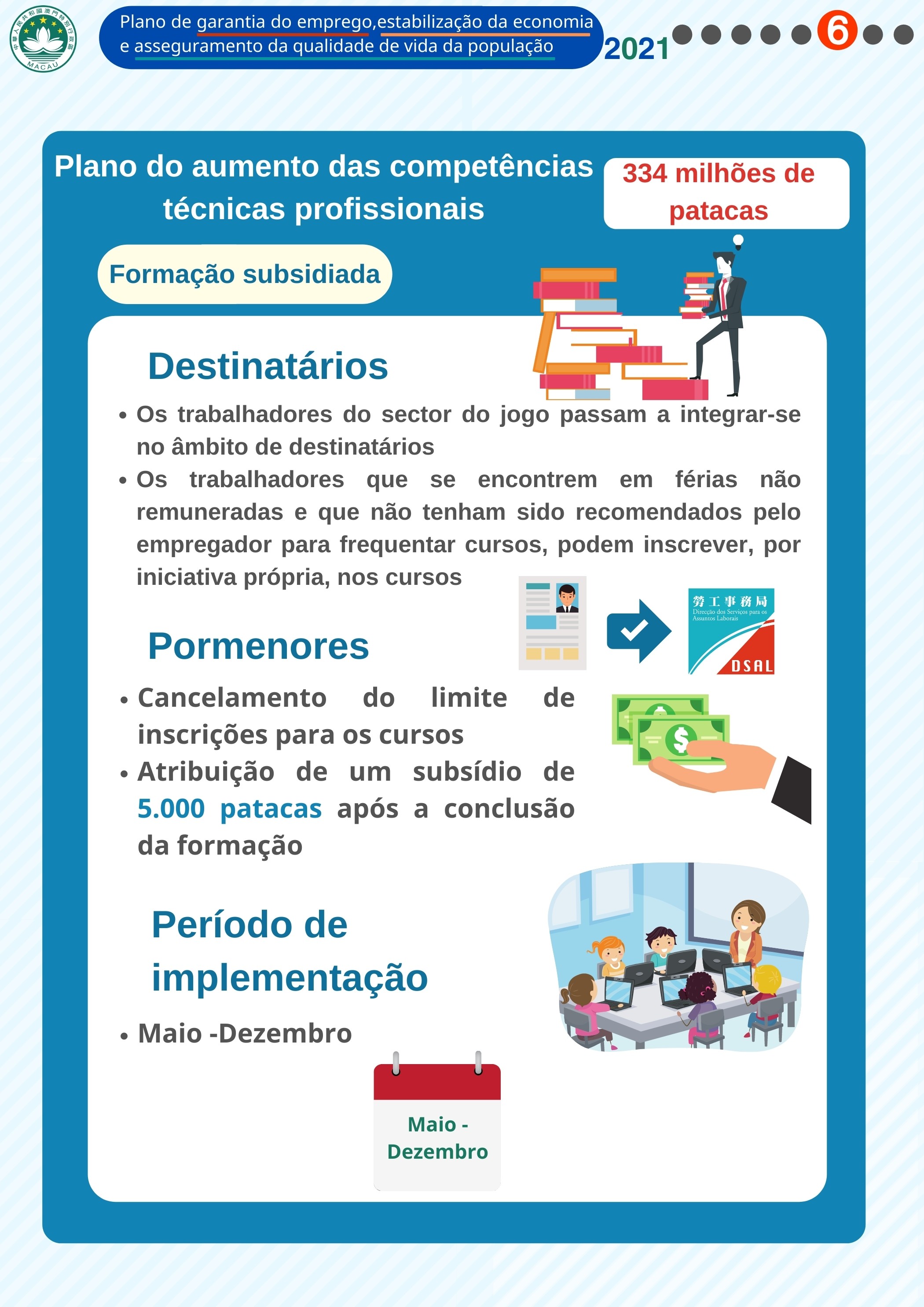 - Esta iniciativa tem uma duração de oito meses, começando a partir de Maio e terminando no final do ano em curso. A verba orçamentada a aplicar é, no total, de 5 mil milhões de patacas que será integralmente atribuída via cupões.