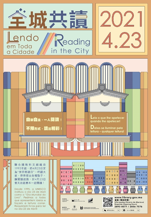 Todos os anos, a 23 de Abril, é comemorado o “Dia Mundial do Livro”. A fim de continuar a promover um ambiente de leitura e o desenvolvimento de hábitos de leitura, o Instituto Cultural e a Direcção dos Serviços de Educação e de Desenvolvimento da Juventude co-organizam, em colaboração com a Biblioteca da Universidade de Macau e a Associação de Bibliotecários e Gestores de Informação de Macau, a edição do evento “4‧23 Lendo em Toda a Cidade” de 2021. A edição deste ano vai ter lugar no dia 23 de Abril e a Organização está a promover “pontos de leitura”, convidando todos os interessados a inscrever-se e a participar neste evento.