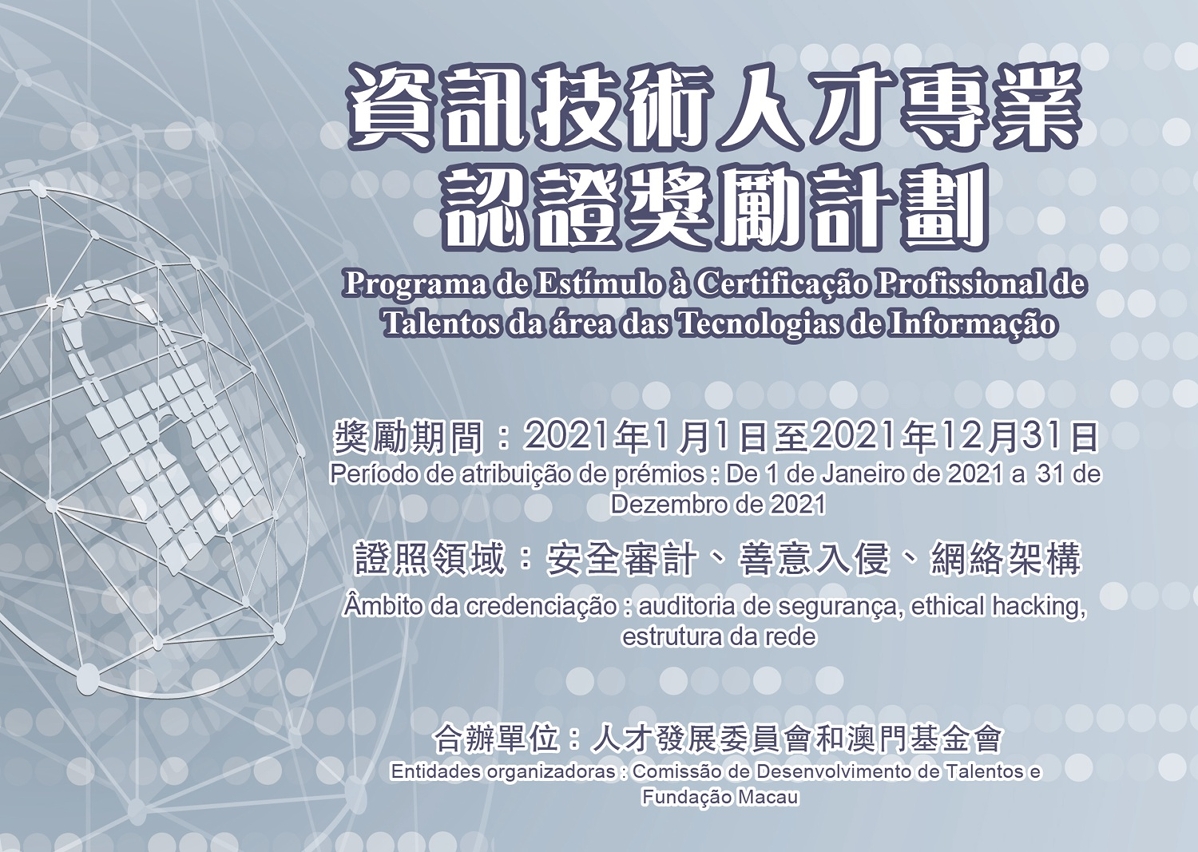 O Programa de Estímulo à Certificação Profissional de Talentos da Área das Tecnologias de Informação visa incentivar os residentes de Macau a submeterem-se aos exames de credenciação profissional nas áreas da cibersegurança, auditoria de sistemas, segurança de dados, entre outras, e a obterem a correspondente certificação para, assim, dotar o sector duma reserva de quadros qualificados com certificação.