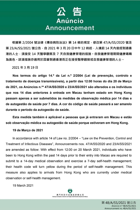 O Centro de Coordenação de Contingência do Novo Tipo de Coronavírus informa que na sequência de mudanças na situação epidémica em Hong Kong e nos termos do artigo 14.º da Lei n.º 2/2004 (Lei de prevenção, controlo e tratamento de doenças transmissíveis), a partir das 12:00 horas do dia 20 de Março de 2021, os Anúncios n.os 47/A/SS/2020 e 23/A/SS/2021 serão alterados e os indivíduos que nos 14 dias anteriores à entrada em Macau tenham estado em Hong Kong são apenas sujeitos a às medidas de observação médica por 14 dias e de autogestão de saúde por 7 dias.