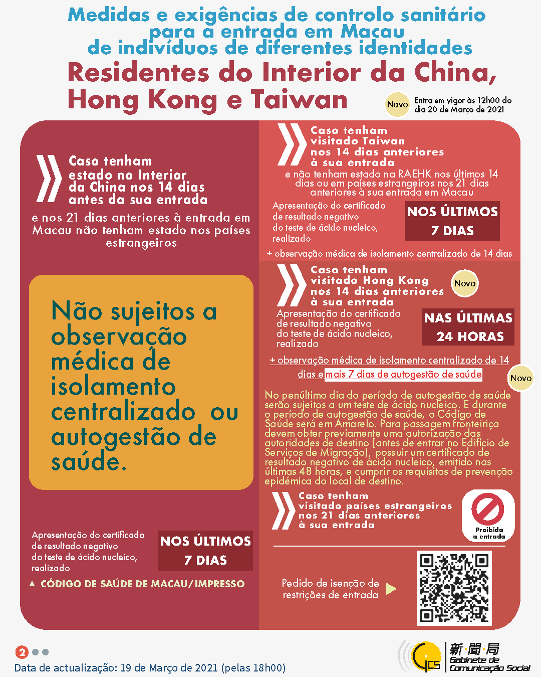 (Infografia)Medidas e exigências de controlo sanitário para a entrada em Macau de indivíduos de diferentes identidades, actualizadas no dia 19 de Março de 2021