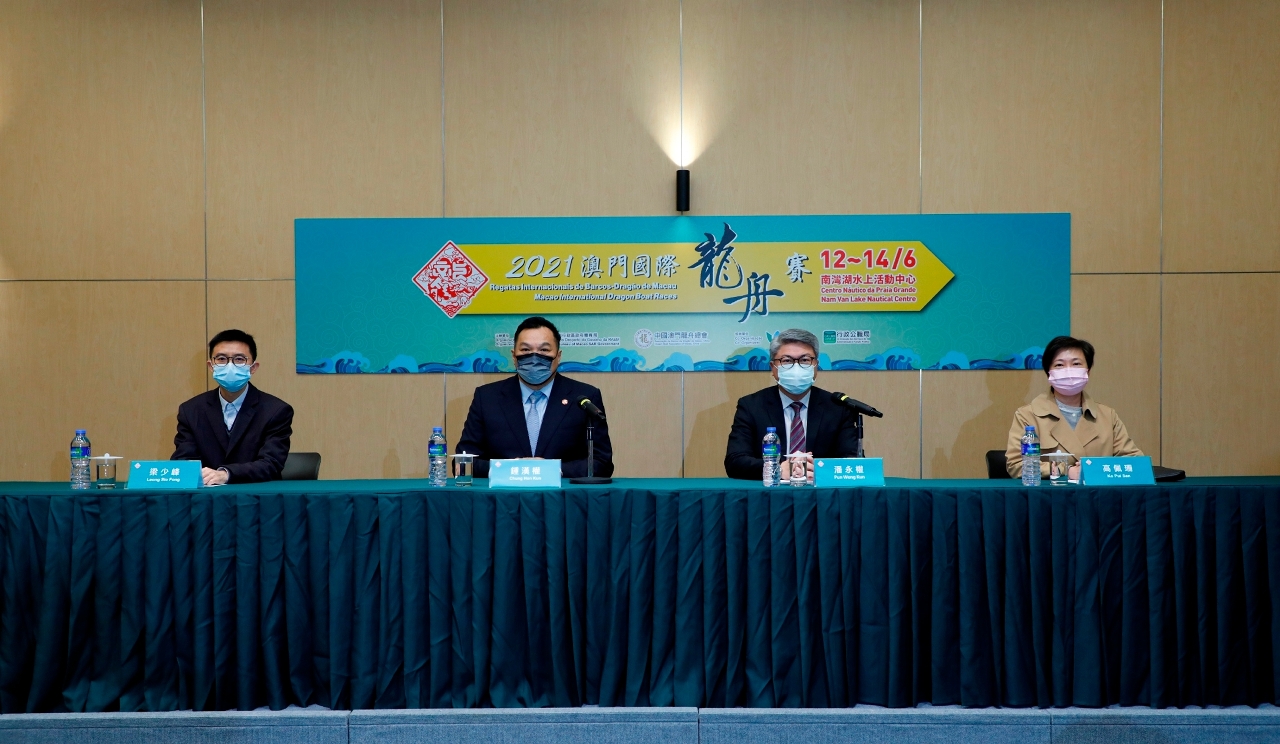 As “Regatas Internacionais de Barcos-Dragão de Macau 2021”, organizadas pelo Instituto do Desporto e pela Associação de Barcos de Dragão de Macau, China e com a colaboração do Instituto para os Assuntos Municipais e da Direcção dos Serviços de Administração e Função Pública, terão lugar nos próximos dias 12 a 14 de Junho no Centro Náutico da Praia Grande. Hoje, dia 23, realizou-se a conferência de imprensa para apresentação de informações detalhadas. Convidados presentes na conferência: Presidente do Instituto do Desporto, Pun Weng Kun, Presidente da Associação de Barcos de Dragão de Macau, China, Chung Hon Kun, Chefe do Departamento dos Assuntos Culturais e Recreativos e de Educação Cívica do Instituto para os Assuntos Municipais, Ko Pui San, Chefe da Divisão de Apoio Social à Função Pública da Direcção dos Serviços de Administração e Função Pública, Leong Sio Fong, e Vice-Presidentes do Instituto do Desporto, Lau Cho Un e Lam Lin Kio.