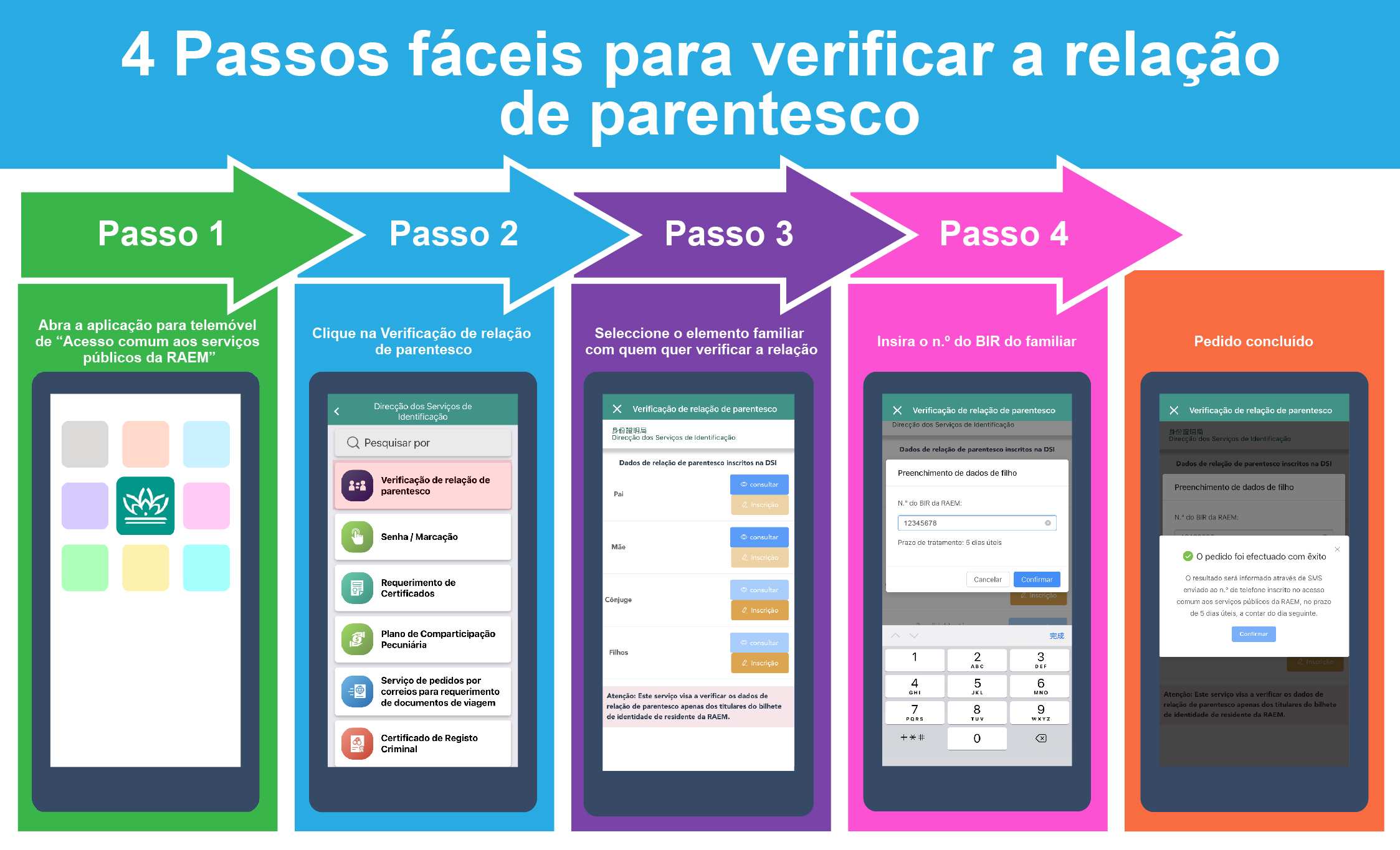 Os titulares do BIR de Macau, que tenham completado 18 anos de idade, podem formular o pedido através da aplicação para telemóvel “Acesso comum aos serviços públicos da RAEM”, bastando fazer login no sistema e inserir o número do BIR do familiar em causa. Após apresentado o pedido com sucesso, o resultado da verificação será notificado ao requerente no prazo de cinco dias úteis. A DSI pode solicitar ao requerente a entrega de provas complementares que considere necessárias. As relações verificadas serão arquivadas no processo do BIR do requerente e do familiar. Este serviço facilitará a abertura on-line da conta única de acesso comum aos serviços públicos da RAEM por pais ou representantes legais a favor de filhos menores de 18 anos através da verificação de identidade, ou seja, do reconhecimento facial no futuro. Mais ainda, na medida em que se vêm a ser lançados faseadamente serviços mais directamente relacionados com o dia-a-dia da população no âmbito do acesso comum aos serviços públicos da RAEM, serão beneficiados mais cidadãos de diferentes faixas etárias.