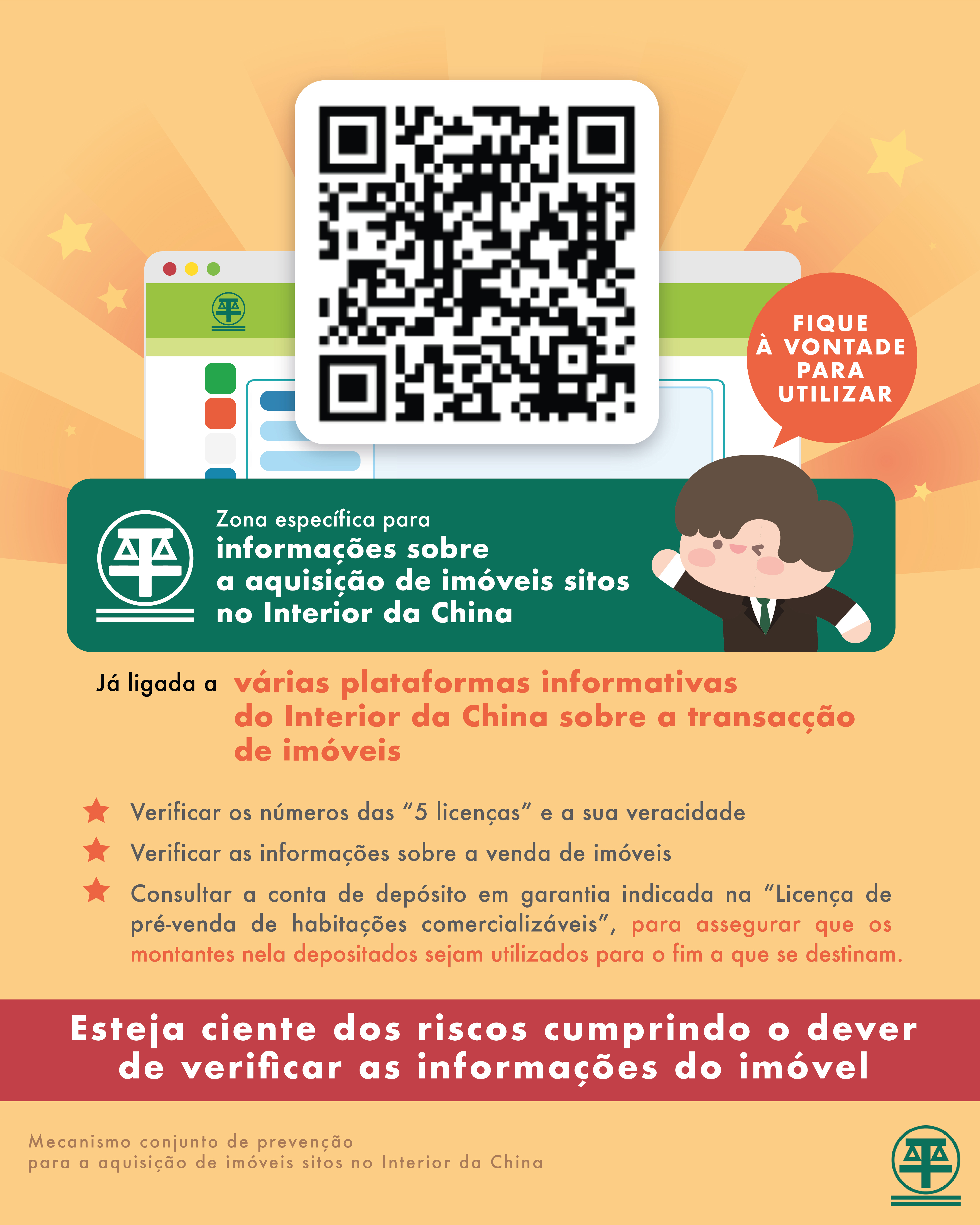 O CC alerta para que os consumidores interessados em comprar habitação no Interior da China, sejam cientes da sua responsabilidade de verificar a autenticidade das informações referentes à aquisição de imóveis, assegurando que a transacção seja processada à luz da lei do Interior da China. Os consumidores podem aceder à zona específica para “informações sobre a aquisição de imóveis sitos no Interior da China”, para confirmar a veracidade das informações dos imóveis autorizados a ser postos à venda, incluindo os números das “5 licenças”, o promotor do empreendimento, a localização do imóvel, o destino, estado de venda e área das fracções e a conta de depósito em garantia.