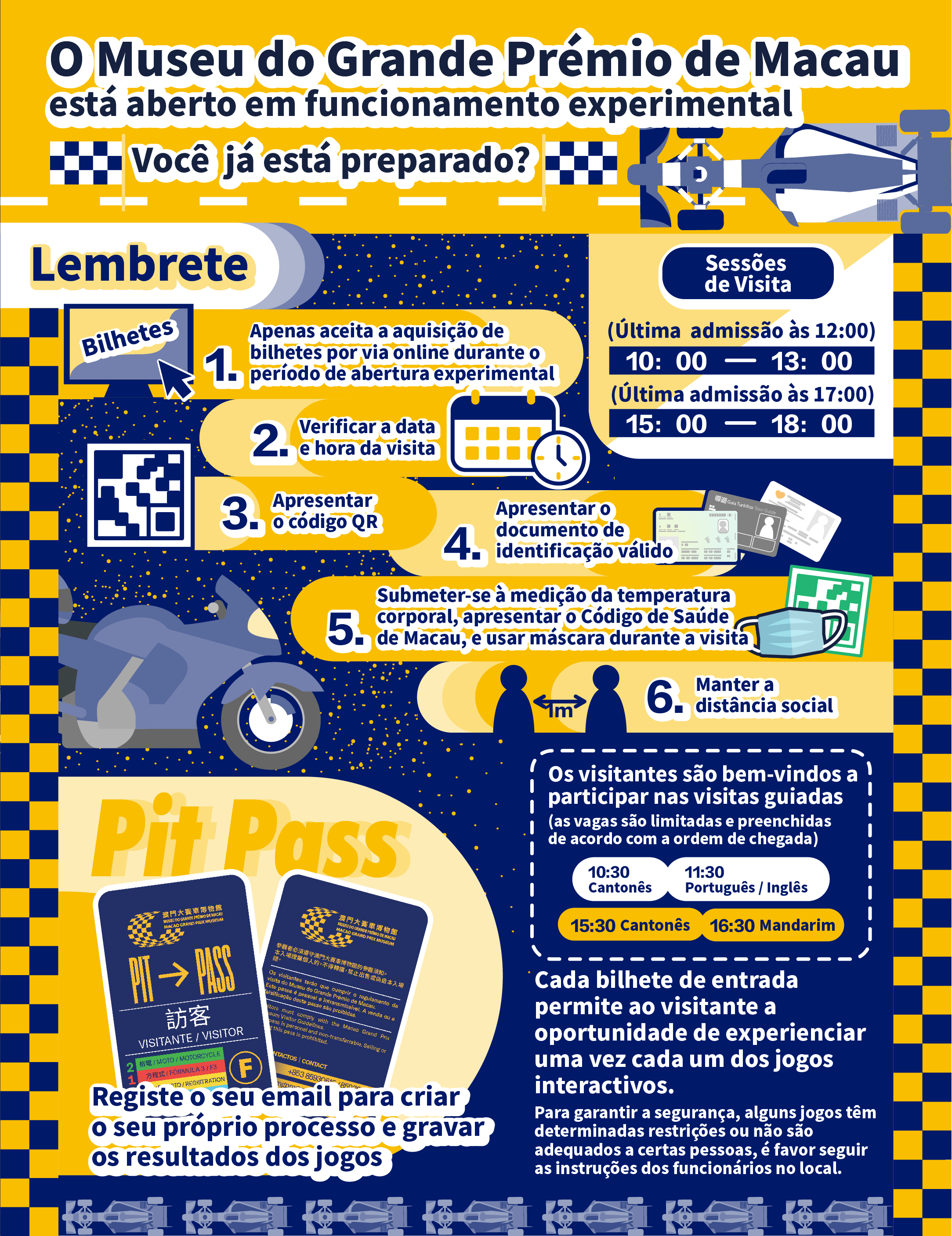 Durante o período de abertura experimental do museu, estarão disponíveis, diariamente, sessões de visitas guiadas ao público. Apela-se que prestem atenção ao horário de diferentes idiomas das visitas guiadas, e são bem-vindos a participarem nas visitas guiadas mediante inscrição presencial no museu. Face ao número limitado de guias disponíveis, as vagas para as visitas guiadas são preenchidas de acordo com a ordem de chegada. O Museu do Grande Prémio de Macau seguirá rigorosamente as orientações para a prevenção e controlo da pandemia emitidas pelos Serviços de Saúde. Os visitantes têm de usar máscara, submeter-se à medição da temperatura corporal e apresentar um Código de Saúde de Macau válido.