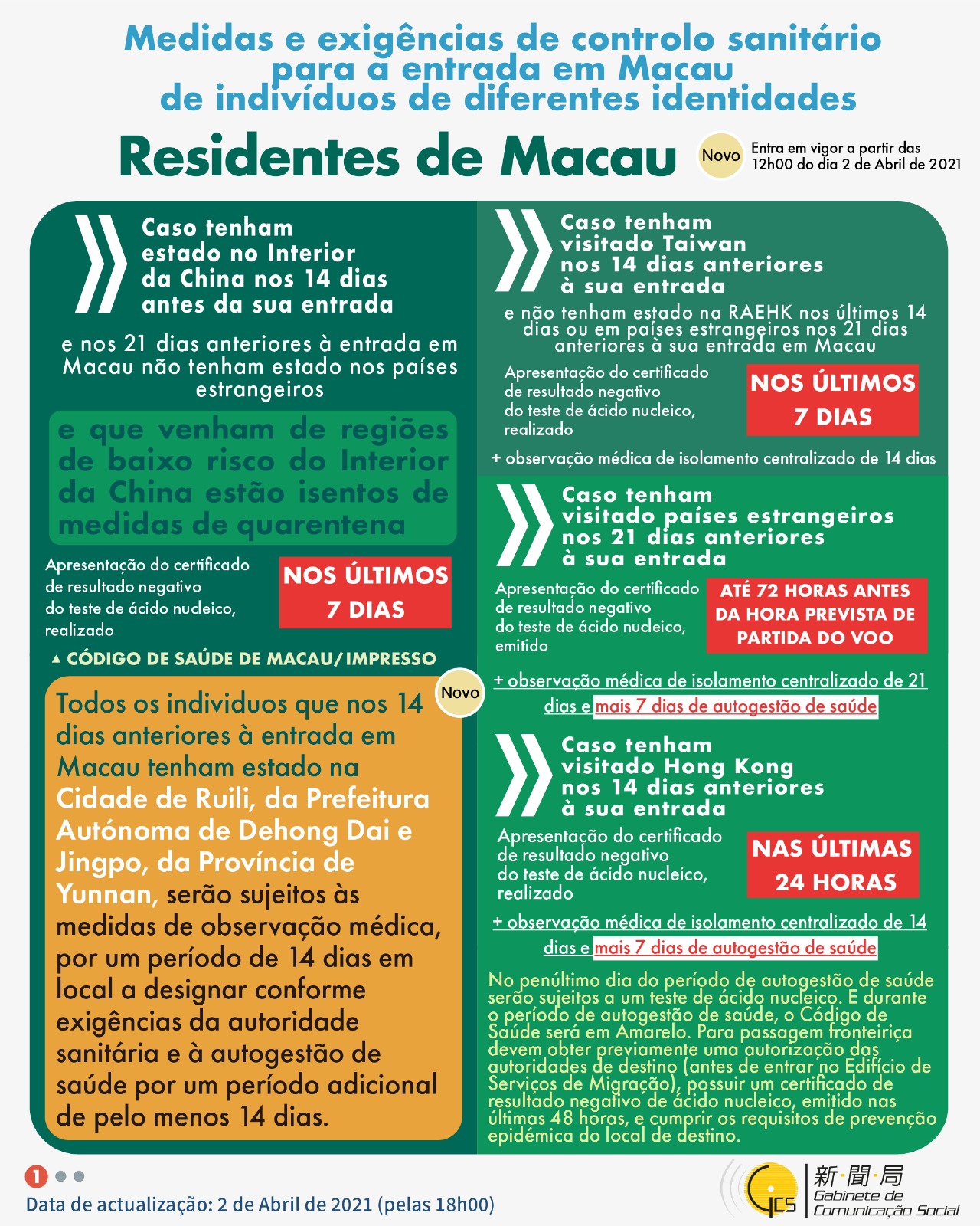 (Infografia)Medidas e exigências de controlo sanitário para a entrada em Macau de indivíduos de diferentes identidades, actualizadas no dia 2 de Abril de 2021