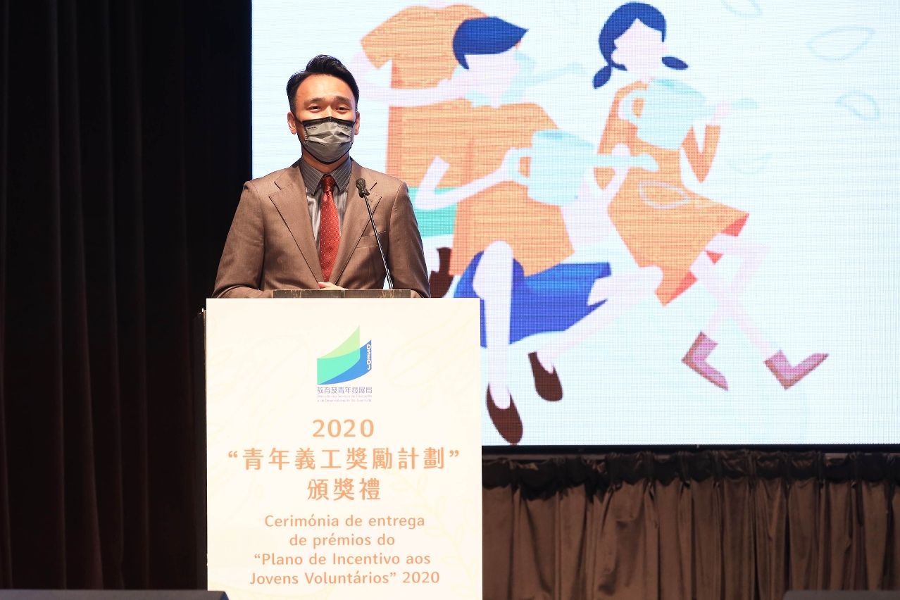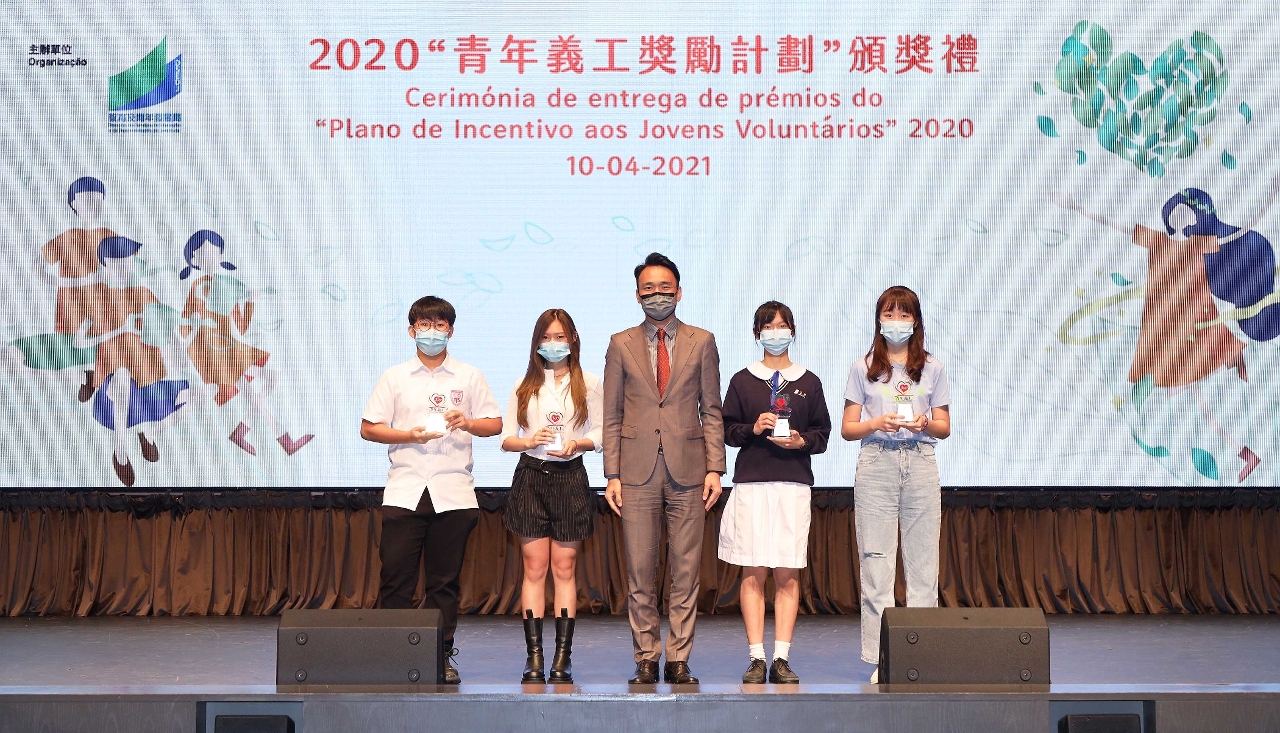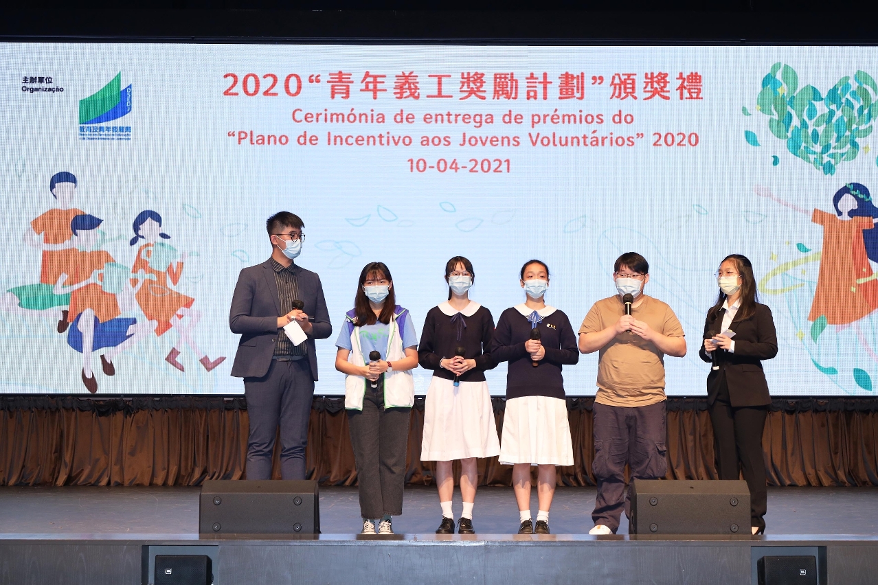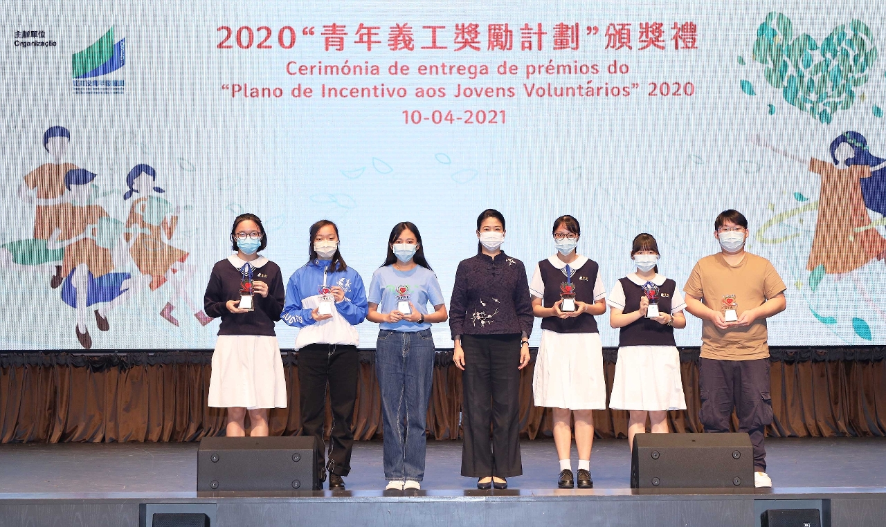 A Cerimónia de Entrega de Prémios do “Plano de Incentivo aos Jovens Voluntários” 2020, organizada pela Direcção dos Serviços de Educação e de Desenvolvimento da Juventude (DSEDJ), teve lugar na tarde do dia 10 de Abril de 2021 (sábado), no auditório da Escola São Paulo de Macau. O evento teve como objectivo elogiar e reconhecer a contribuição e o comprometimento dos jovens voluntários, em prol da sociedade, promovendo a adesão por parte dos vários sectores da sociedade e dos jovens, estimulando a participação positiva dos jovens nos trabalhos voluntários e desenvolvendo o espírito de entreajuda, trazendo, em conjunto, mais energia positiva à sociedade de Macau. A cerimónia contou com a presença dos seguintes convidados: o Subdirector da DSEDJ, Kong Chi Meng, a adjunta do Comandante-geral dos Serviços de Polícia Unitários, Lao Wan Seong, os vogais do Conselho de Juventude, os representantes dos serviços e entidades públicas aderentes, os representantes das associações sociais e das escolas, bem como os jovens voluntários, num total de mais de 180 participantes.