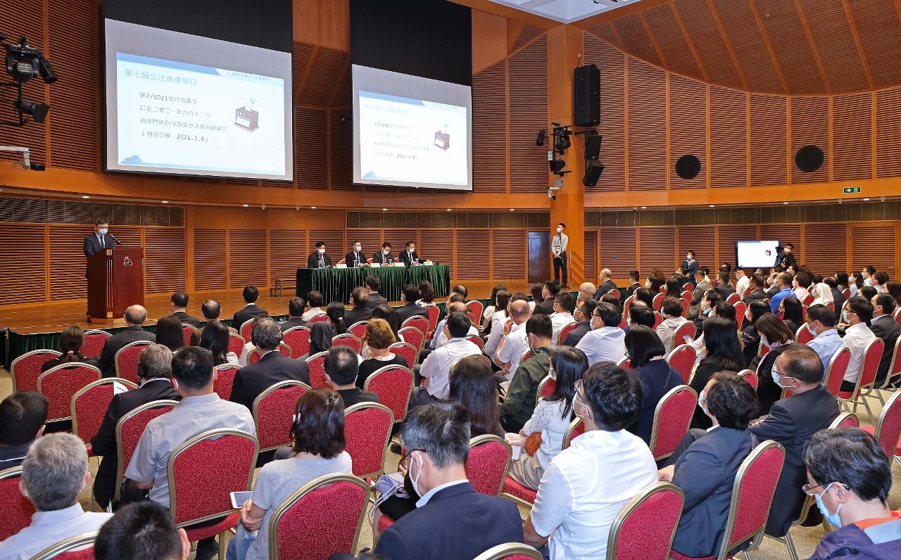 As Eleições para a 7.ª Assembleia Legislativa terão lugar no dia 12 de Setembro de 2021. Para que o sector educacional conheça e cumpra o conteúdo e as normas do “Regime Eleitoral da Assembleia Legislativa da RAEM”, domine o significado das eleições, o espírito jurídico e o correcto exercício do sufrágio, incentivando o pessoal docente e não docente e os estudantes a reforçarem a sua consciencialização sobre o conceito de eleições limpas, a Direcção dos Serviços de Educação e de Desenvolvimento da Juventude (DSEDJ) convidou a Comissão de Assuntos Eleitorais da Assembleia Legislativa (CAEAL) para realizar, no dia 21 de Abril, no Centro de Convenções do Centro de Ciência de Macau, uma sessão de esclarecimento, destinada ao sector educacional, sobre o Regime Eleitoral da Assembleia Legislativa da RAEM. A sessão contou com a presença do presidente da CAEAL, Tong Hio Fong, dos vogais Lai U Hou e Kou Peng Kuan, do director da DSEDJ, Lou Pak Sang, dos subdirectores da DSEDJ, Kong Chi Meng e Teng Sio Hong, da subdirectora dos Serviços de Administração e Função Pública (SAFP), Joana Maria Noronha, e de mais de 200 responsáveis e representantes das instituições do ensino superior e das escolas do ensino não superior, bem como de pessoal de chefia da DSEDJ e dos SAFP.