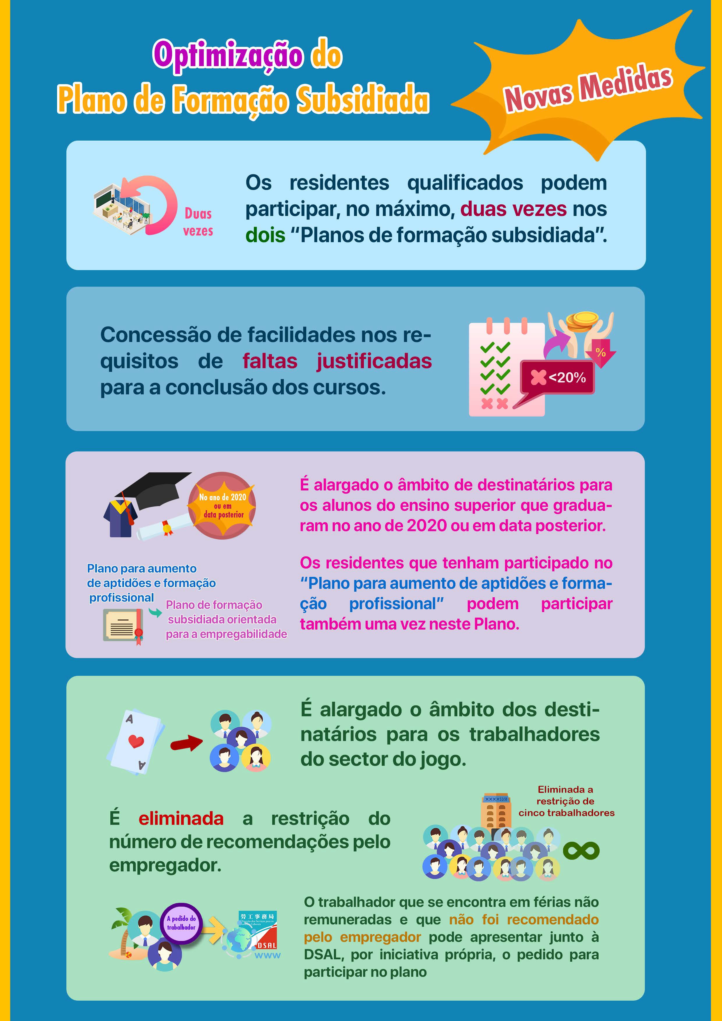 Após as novas alterações ao Regulamento Administrativo, o âmbito dos destinatários do “Plano de formação subsidiada orientada para o aumento das competências técnicas” é alargado aos trabalhadores do sector do jogo, sendo que, aqueles que se encontrem de férias não remuneradas e que não foram recomendados pelo empregador para participar no curso, podem inscrever-se por iniciativa própria. A par disso, é eliminada a restrição do número de trabalhadores a ser recomendado. Por outro lado, os requisitos para a participação no “Plano de formação subsidiada orientada para a empregabilidade” também é alargado aos alunos que tenham graduado no ano 2020 ou posteriormente. Além disso, os residentes que preenchem os requisitos dos respectivos Planos, podem participar duas vezes em cada um dos “Plano de formação subsidiada orientada para a empregabilidade” e “Plano de formação subsidiada orientada para o aumento das competências técnicas”. No Regulamento também são concedidas facilidades nos requisitos para a conclusão dos cursos. Para além das faltas por doença, caso as faltas sejam aceites e consideradas justificadas pela DSAL e o número de horas de faltas não ultrapasse 20% do número total de horas do curso, o curso é considerado como concluído.