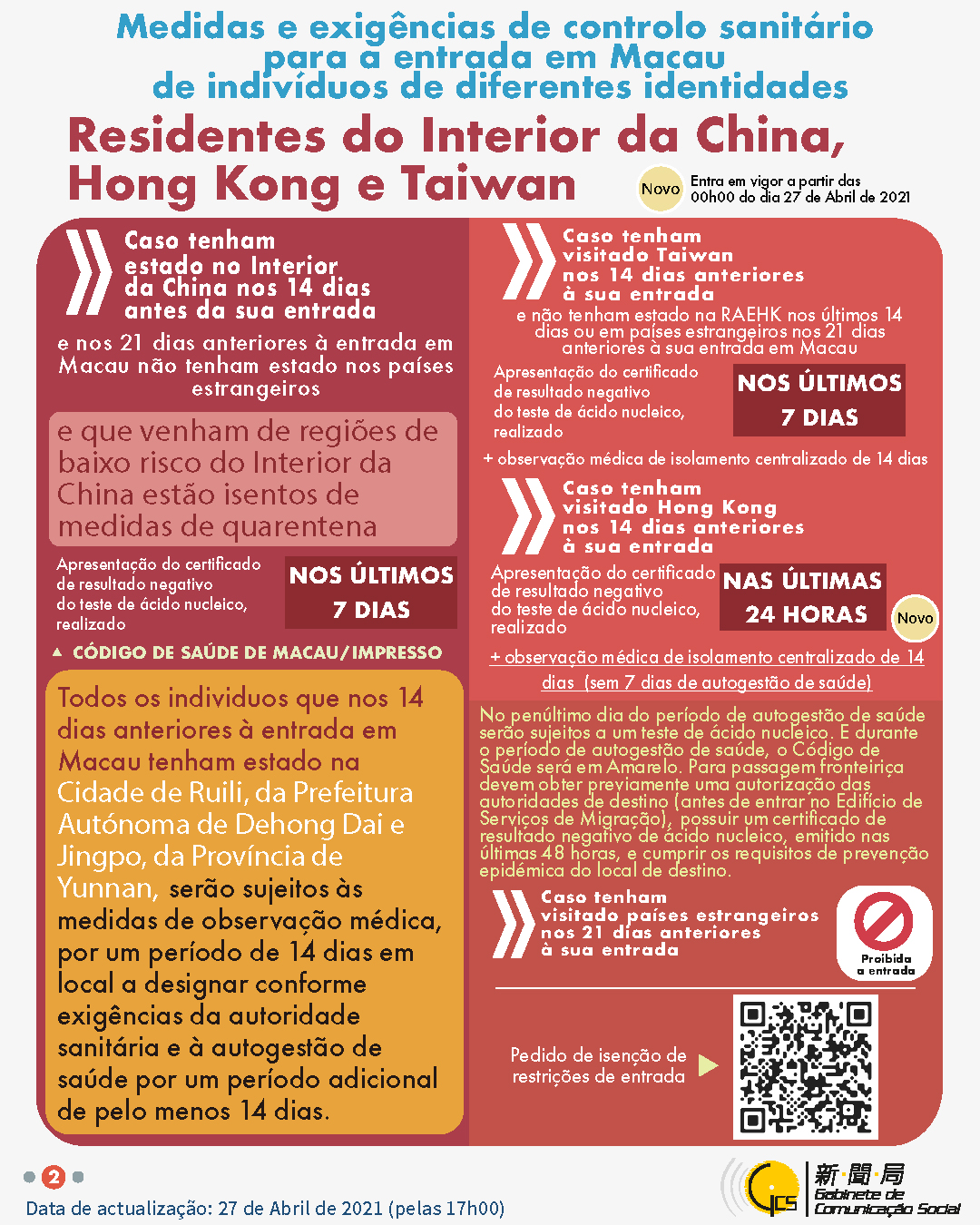 (Infografia)Medidas e exigências de controlo sanitário para a entrada em Macau de indivíduos de diferentes identidades, actualizadas no dia 27 de Abril de 2021