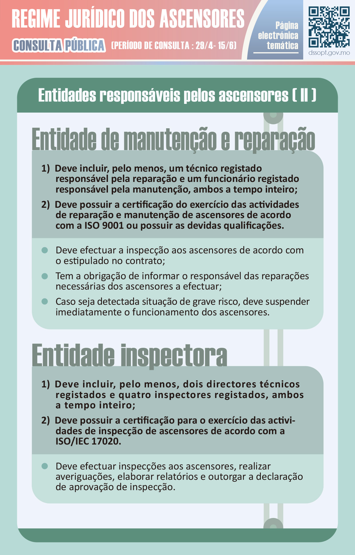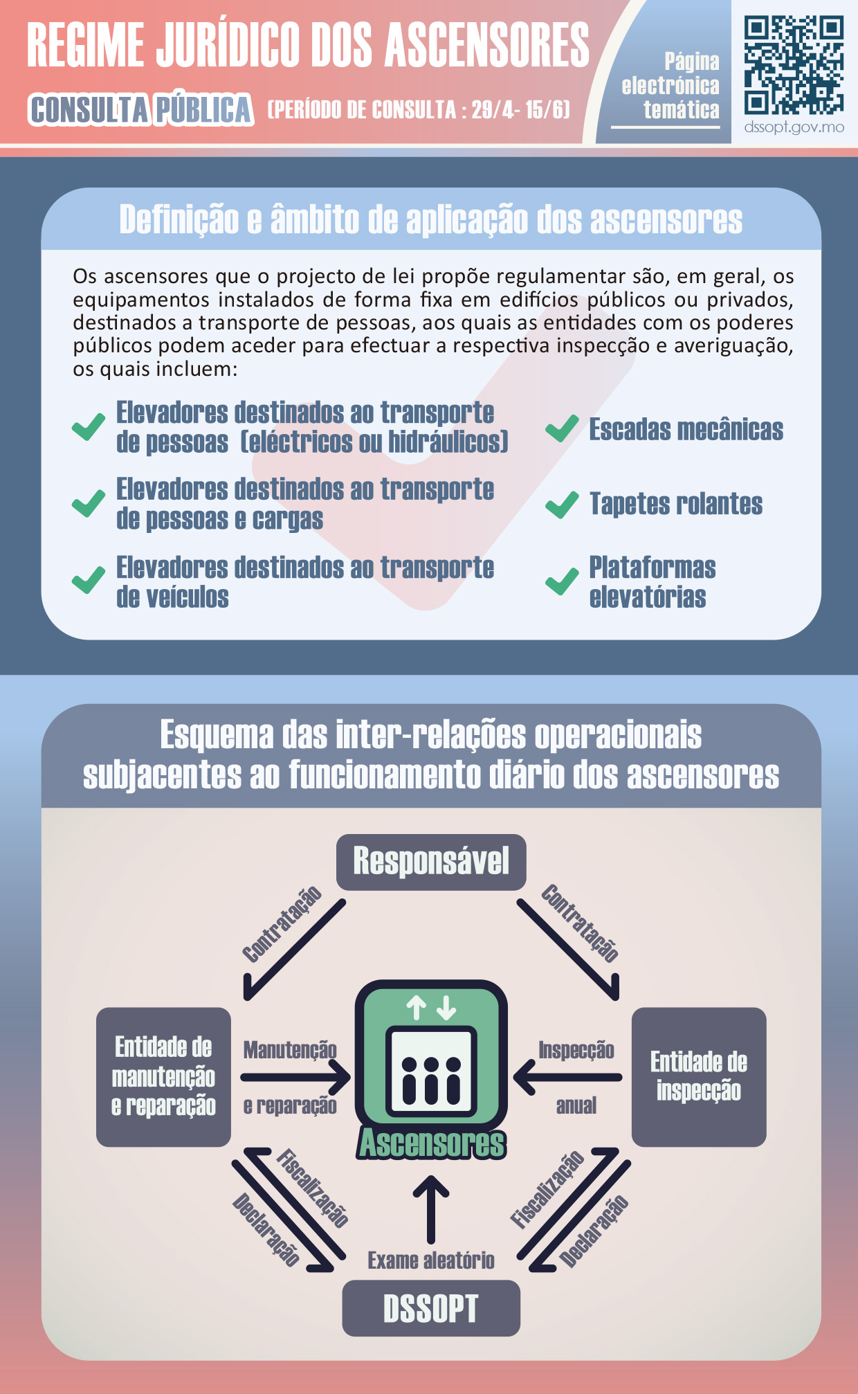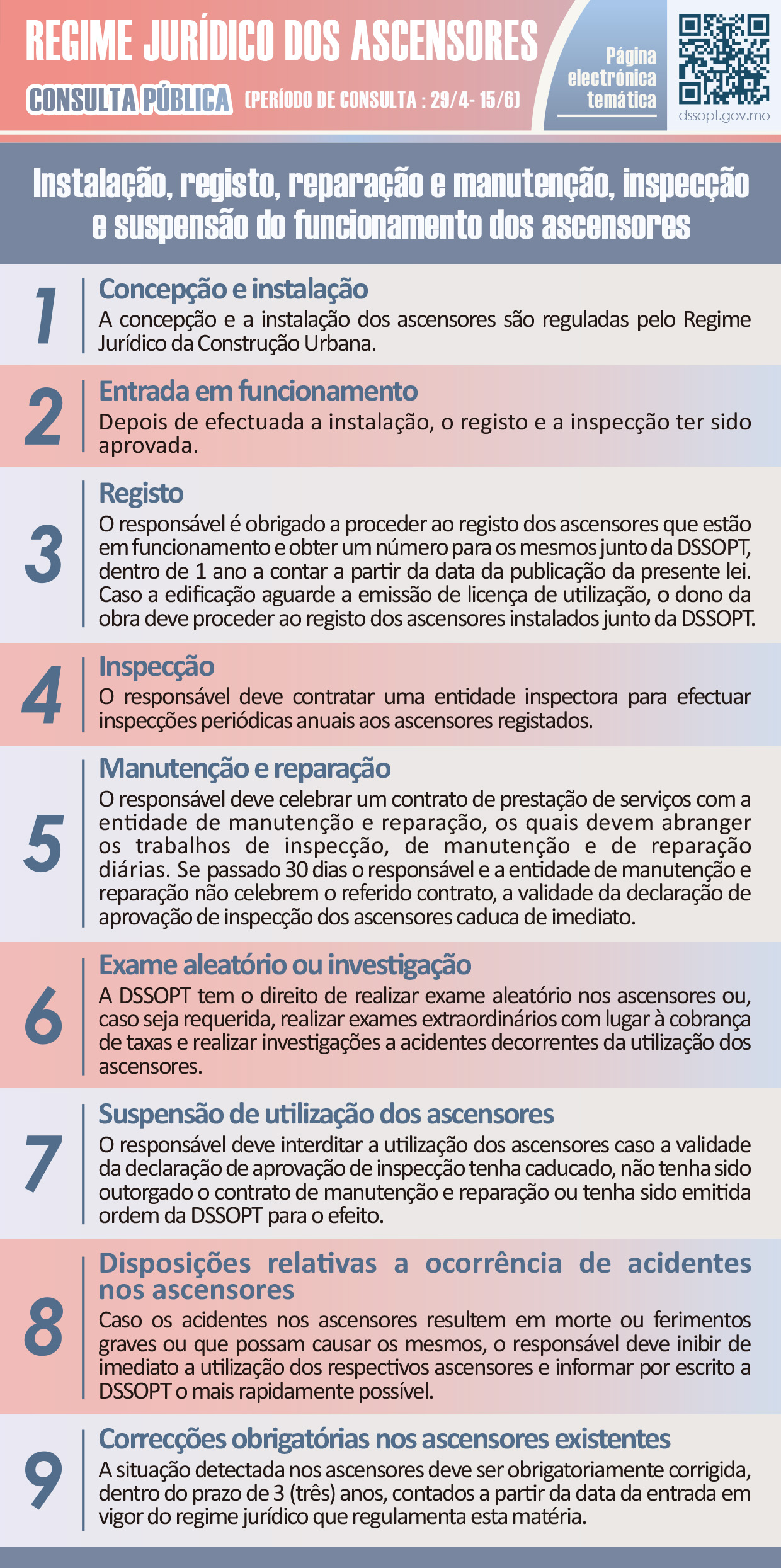 Para a futura implementação do “Regime jurídico dos ascensores” com base nas opiniões e sugestões apresentadas pelo público, o Governo da RAEM elaborou o documento que será submetido à consulta pública. Este documento propõe clarificar as atribuições das partes interessadas, regulamentar a entidade de manutenção e reparação e a entidade inspectora, clarificar os diversos procedimentos e exigências, etc., e abrange cinco capítulos, nomeadamente o “âmbito de aplicação dos ascensores”, as “entidades responsáveis pelos ascensores”, a “instalação, registo, reparação e manutenção, inspecção e suspensão do funcionamento dos ascensores”, as “disposições relativas à entidade de manutenção e reparação e à entidade inspectora” e as “penalidades”.