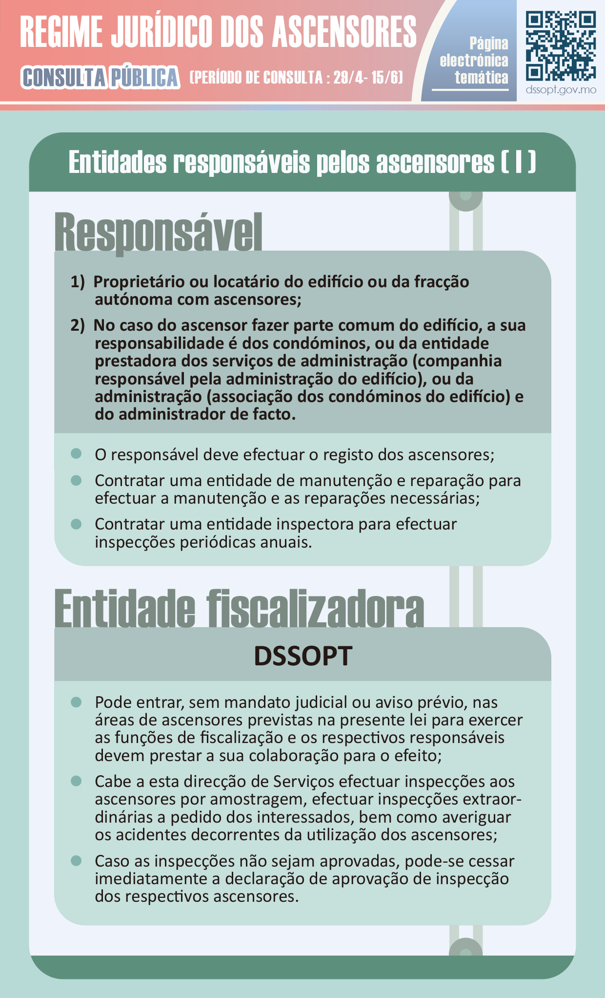 O “âmbito de aplicação dos ascensores” que o documento de consulta propõe abrange os elevadores destinados ao transporte de pessoas, os elevadores destinados ao transporte de pessoas e cargas, os elevadores destinados ao transporte de veículos, as escadas mecânicas, os tapetes rolantes e as plataformas elevatórias inclinadas. Há quatro entidades responsáveis, nomeadamente o proprietário, locatário e administração do edifício, a entidade de manutenção e reparação, a entidade inspectora e a entidade fiscalizadora. Para uma fiscalização mais eficaz, propõe-se que essa competência seja atribuída à Direcção dos Serviços de Solos, Obras Públicas e Transportes (DSSOPT), sem prejuízo das competências delegadas pela lei à entidade responsável pela administração.