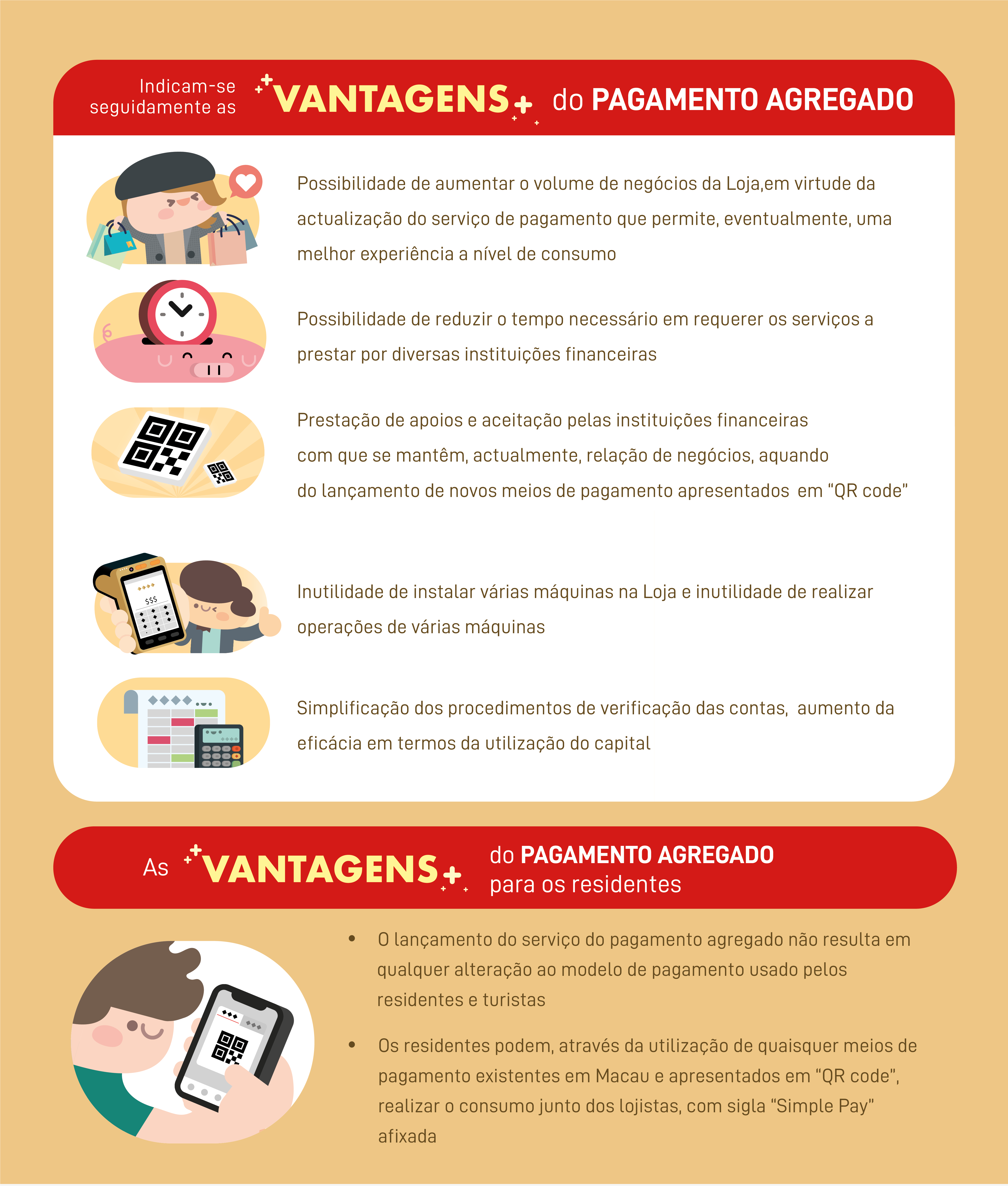 O procedimento de actualização do serviço “Simple Pay” é simples e fácil, havendo neste momento cinco instituições financeiras que proporcionam os serviços de “Simple Pay”, podendo os comerciantes proceder uma comparação das mesmas. A AMCM solicita aos comerciantes a actualização do serviço de pagamento agregado sob a sigla “Simple Pay”, de modo a elevar a sua competitividade através da transformação digital. Relativamente à apresentação e às respectivas informações do serviço de pagamento agregado sob a sigla “Simple Pay”, por favor aceda à Página electrónica temática do serviço de pagamento agregado sob a sigla “Simple Pay”(https://www.amcm.gov.mo/zh/news-and-announcements/simplepay).