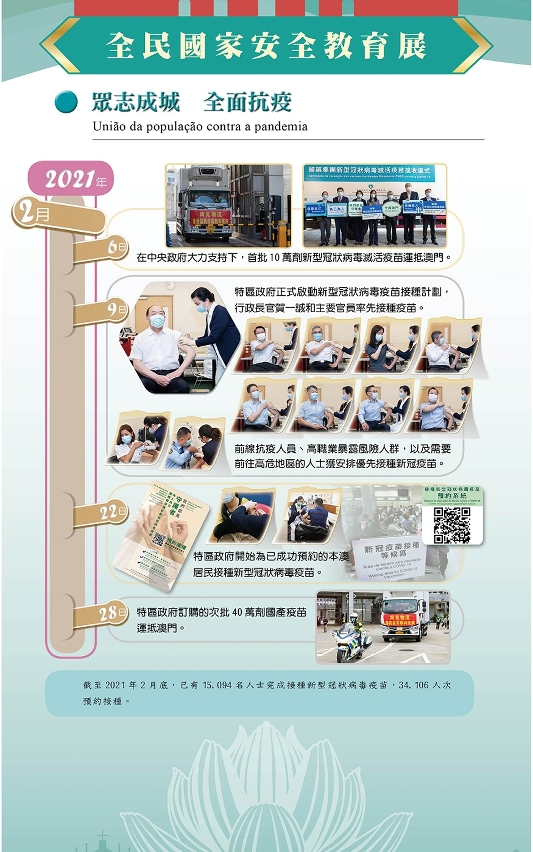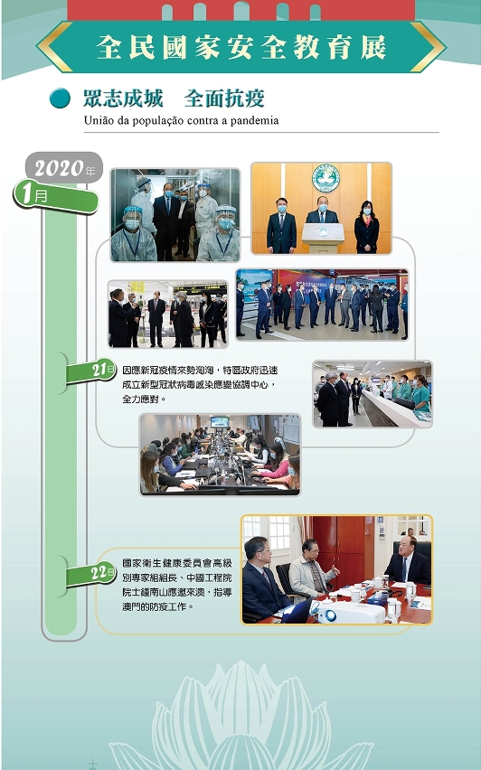 Por outro lado, a resposta a incidentes imprevistos de saúde pública é uma iniciativa importante para garantir a segurança nacional. O súbito surto da epidemia da pneumonia causada pelo novo tipo de coronavírus, no ano passado, constituiu um enorme desafio para a Pátria, em termos de segurança geral. Com o forte e total apoio e atenção do Governo Central, o Governo da RAEM tem vindo, em união com todos os residentes, a dar respostas científicas à epidemia, superando as dificuldades e salvaguardando a vida e a saúde dos residentes. Ademais, as medidas de prevenção e controlo da epidemia adoptadas têm permitido a recuperação gradual da economia. Assim, a exposição demonstra a união entre o governo e todos os residentes, o percurso de luta contra a epidemia, bem como os resultados obtidos no âmbito de prevenção e controle de pandemia.