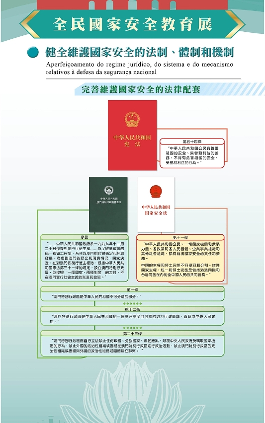 O Governo da Região Administrativa Especial de Macau (RAEM) e o Gabinete de Ligação do Governo Popular Central na RAEM co-organizam, uma vez mais, a «Exposição de Educação sobre a Segurança Nacional». O capítulo de «A defesa da segurança nacional garante a implementação estável e duradoura do princípio “um país, dois sistemas”» apresenta os trabalhos de regime jurídico e mecanismos relacionados com o aperfeiçoamento da defesa da segurança do Estado, incluindo a sua legislação complementar.
