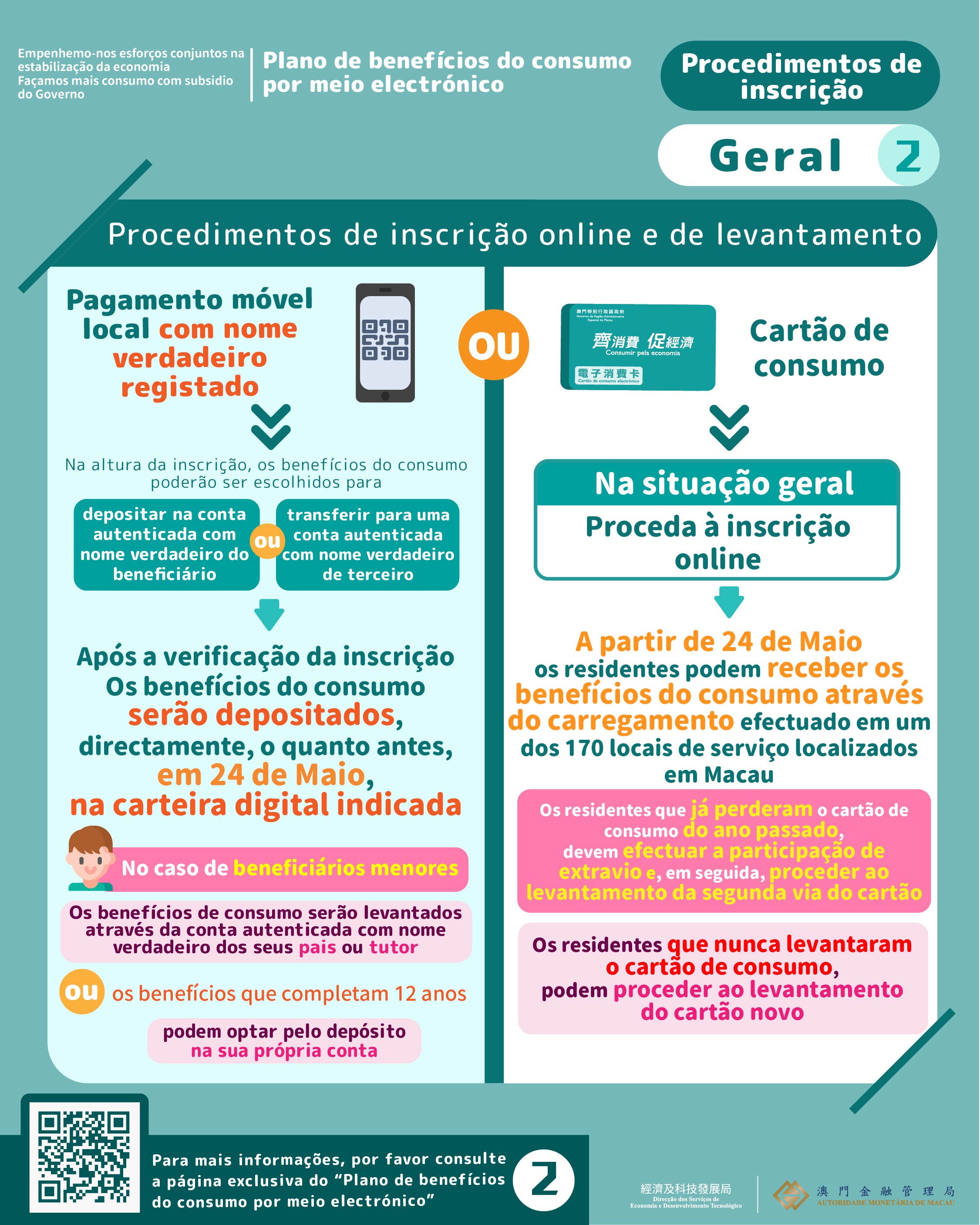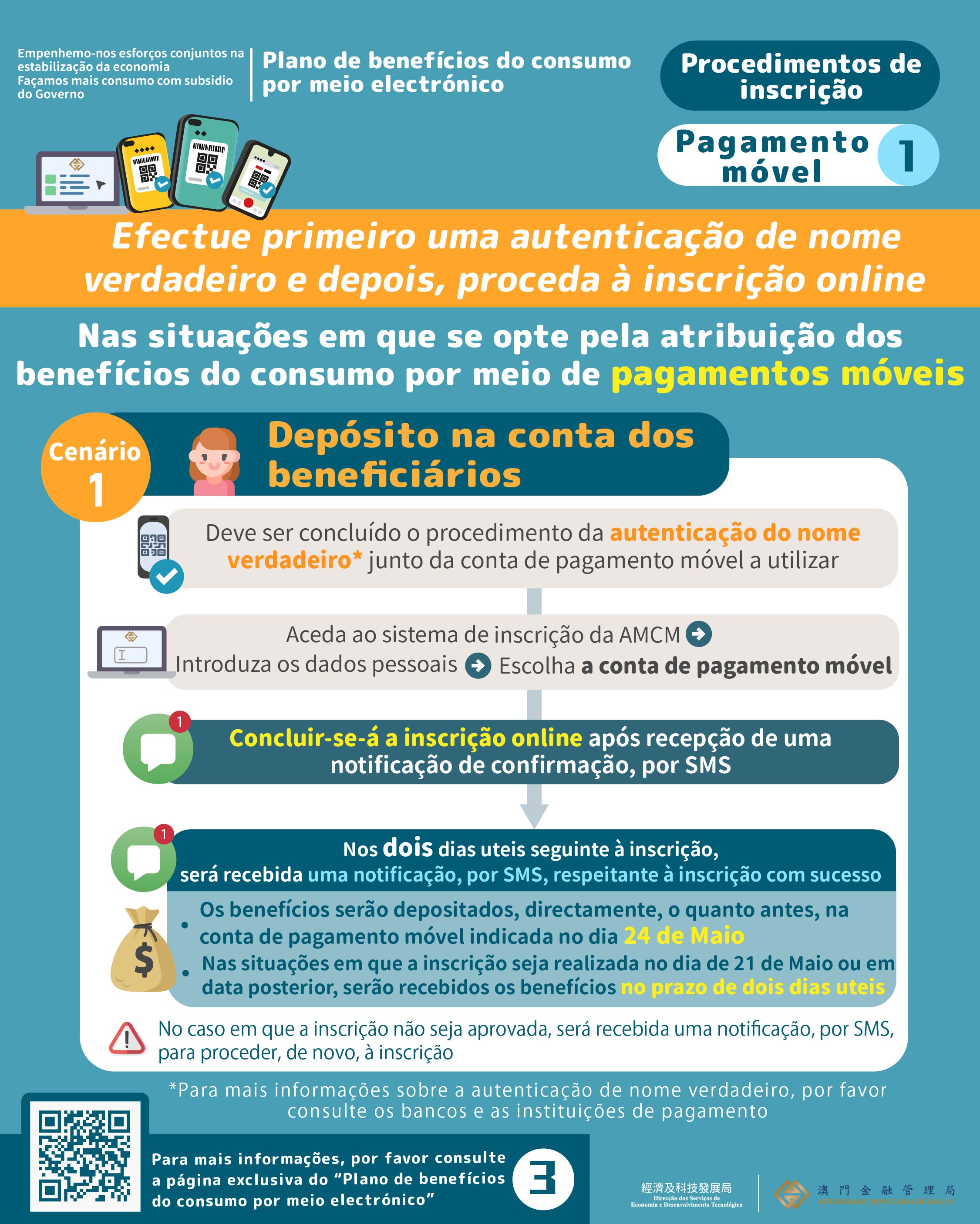 Os procedimentos de inscrição são simples, no caso de optar pelo meio de “pagamento móvel”, os residentes devem proceder, previamente, à abertura de uma conta autenticada com nome verdadeiro junto da respectiva instituição financeira participante neste plano. Aquando da realização da inscrição, os residentes podem optar pelo depósito dos benefícios do consumo na sua conta autenticada com nome verdadeiro, ou pela transferência dos benefícios do consumo para a conta autenticada com nome verdadeiro de terceiro; nas situações dos beneficiários menores, os seus benefícios do consumo podem ser transferidos para a conta de pagamento móvel do pai, da mãe ou do tutor. Aliás, nas situações em que os menores de 12 a 17 anos de idade tenham procedido à abertura de uma conta autenticada com o nome verdadeiro, esses podem usufruir dos próprios benefícios, através de uma prévia inscrição.