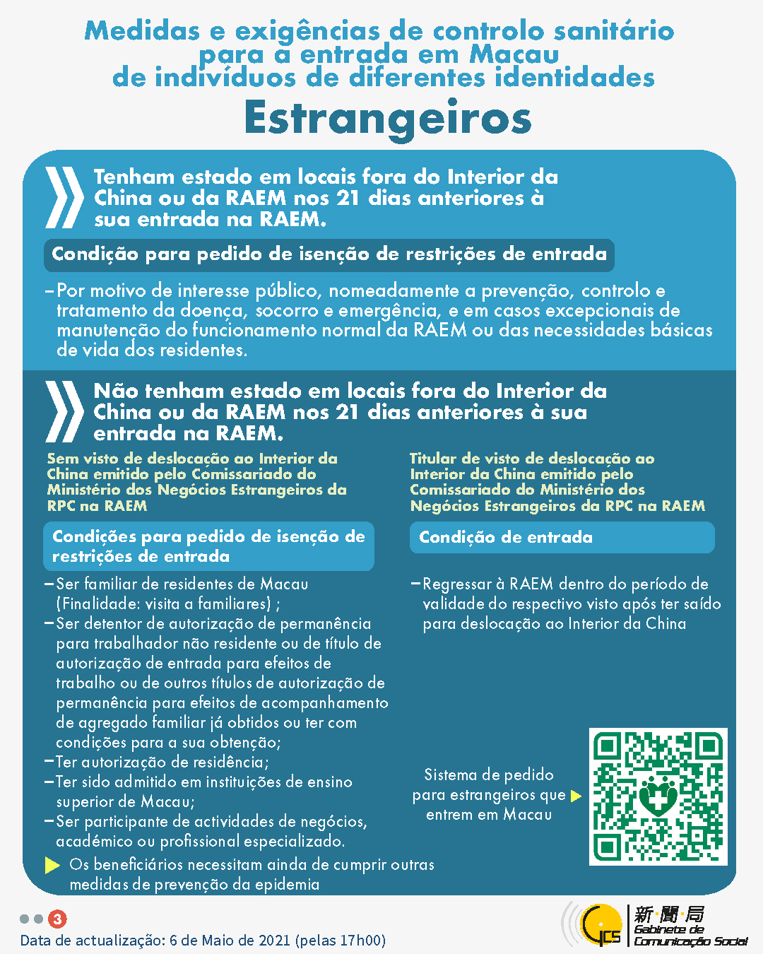 (Infografia)Medidas e exigências de controlo sanitário para a entrada em Macau de indivíduos de diferentes identidades, actualizadas no dia 6 de Maio de 2021