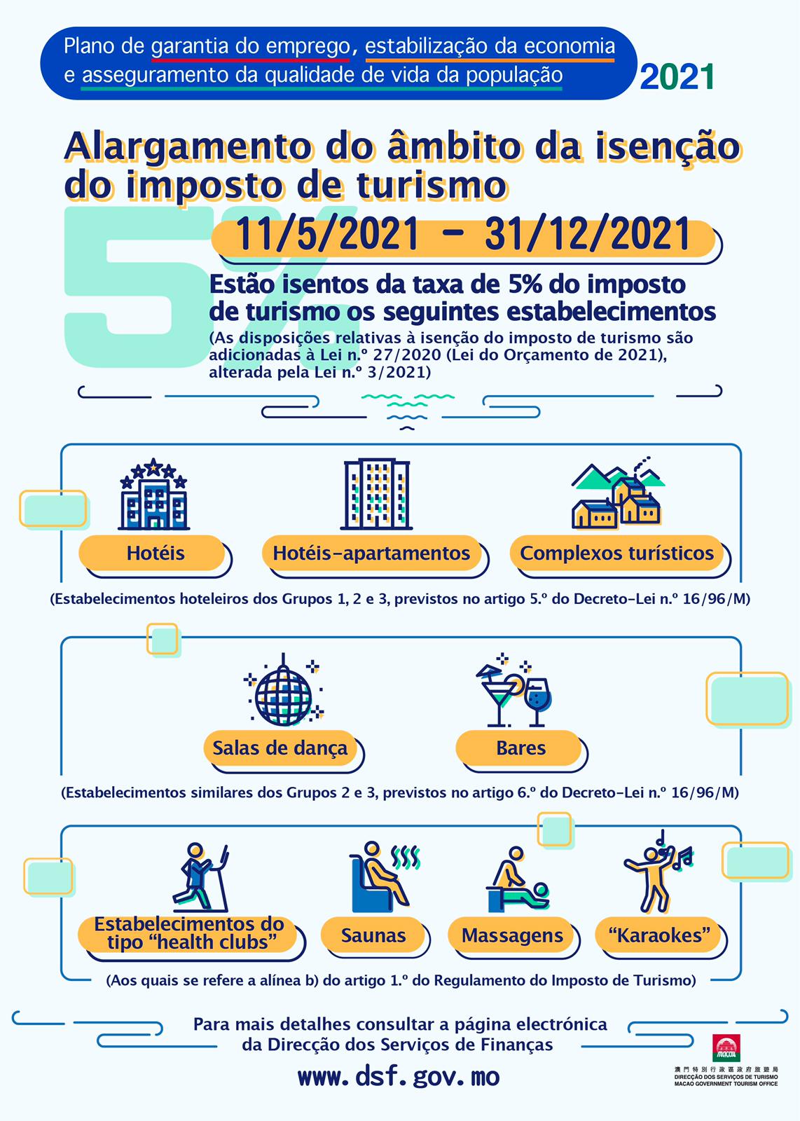 De acordo com as disposições relativas à isenção do imposto de turismo na Lei do Orçamento de 2021, alterada pela Lei n.º 3/2021, os estabelecimentos estão isentos da taxa de 5% do imposto de turismo, contando-se o período de isenção desde 11 de Maio até 31 de Dezembro de 2021.