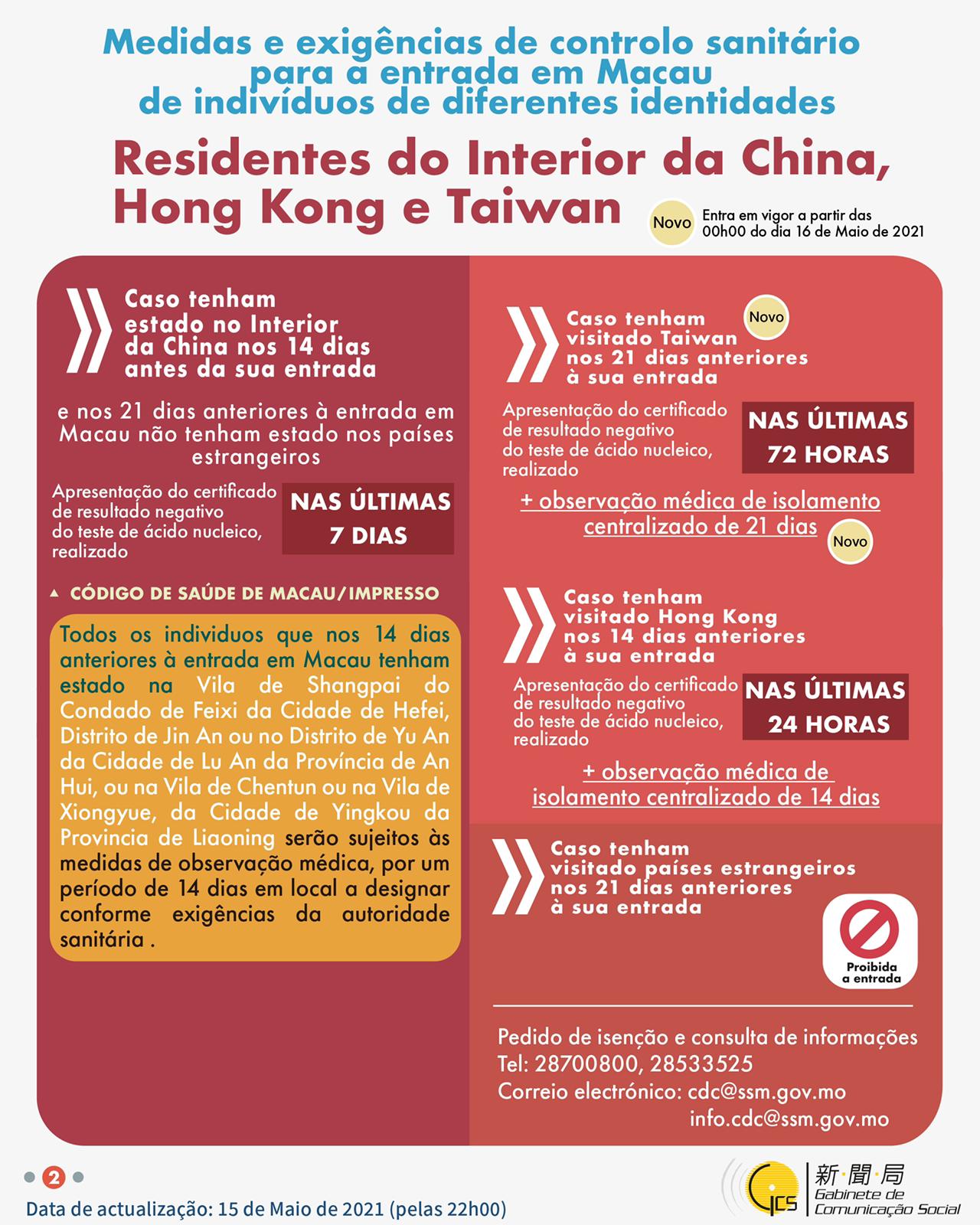(Infografia)Medidas e exigências de controlo sanitário para a entrada em Macau de indivíduos de diferentes identidades, actualizadas no dia 16 de Maio de 2021