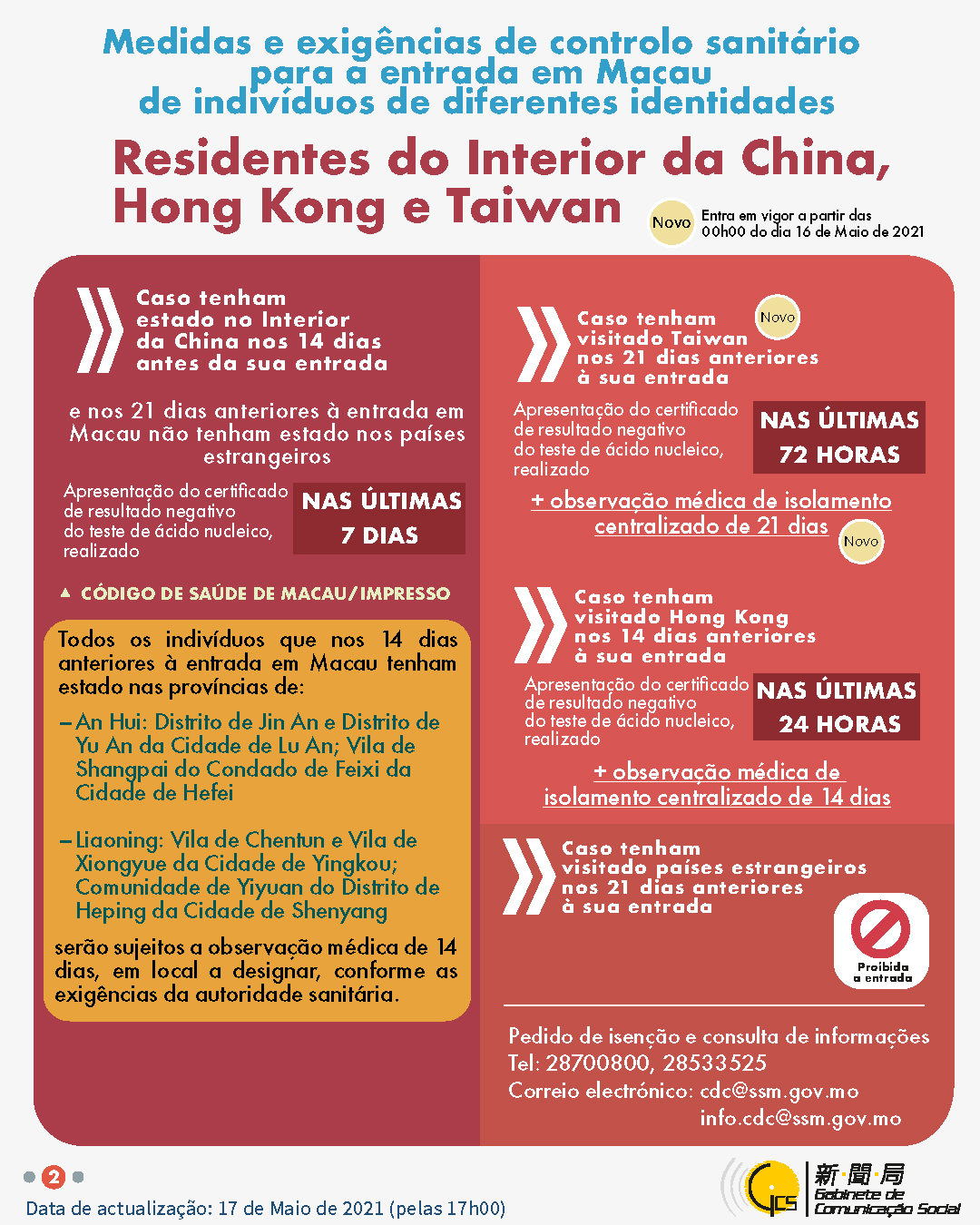 (Infografia)Medidas e exigências de controlo sanitário para a entrada em Macau de indivíduos de diferentes identidades, actualizadas no dia 17 de Maio de 2021