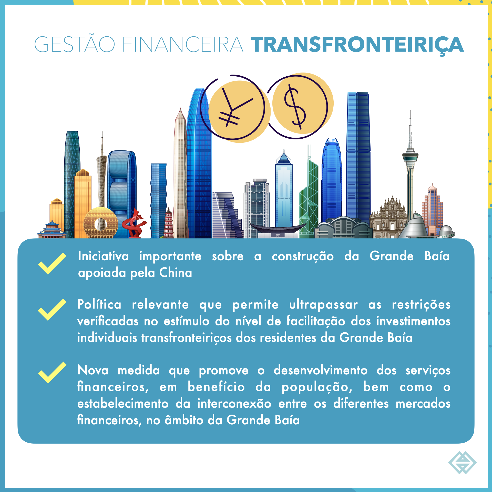 A partir de 6 de Maio, o Banco Popular da China efectuou uma consulta pública sobre a “Regulamentação do desenvolvimento, na Grande Baía Guangdong-Hong Kong-Macau, de actividades no âmbito do Projecto-piloto denominado por “Gestão Financeira Transfronteiriça””. Antes disso, as autoridades de gestão financeira do Interior da China, Macau e Hong Kong (incluindo a AMCM, o Banco Popular da China, a “China Banking and Insurance Regulatory Commission (CBIRC)”, a Comissão Reguladora de Valores da China, a Administração Estatal de Divisas Estrangeiras (SAFE), a “Hong Kong Monetary Authority (HKMA)” e a “Hong Kong Securities and Futures Commission (HKSFC)”) celebraram conjuntamente o “Memorando de entendimento sobre o desenvolvimento, na Grande Baía Guangdong-Hong Kong-Macau, de actividades no âmbito do Projecto-piloto denominado por “Gestão Financeira Transfronteiriça””, tendo vindo a discutir e a comunicar de forma constante sobre a regulamentação concreta e pormenorizada relativa à implementação das actividades de “Gestão Financeira Transfronteiriça”.