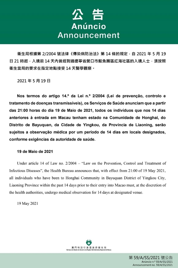 Centro de Coordenação de Contingência do Novo Tipo de Coronavírus informa que tendo em consideração a evolução epidemiológica mais actualizada da Província de Liaoning, nos termos do artigo 14.º da Lei n.º 2/2004 (Lei de prevenção, controlo e tratamento de doenças transmissíveis), a partir das 21:00 horas do dia 19 de Maio de 2021, todos os indivíduos que nos 14 dias anteriores à entrada em Macau tenham estado na Comunidade de Honghai, do Distrito de Bayuquan, da Cidade de Yingkou, da Província de Liaoning, serão sujeitos a medidas de observação médica por um período de 14 dias em local a designar conforme exigências da autoridade sanitária.