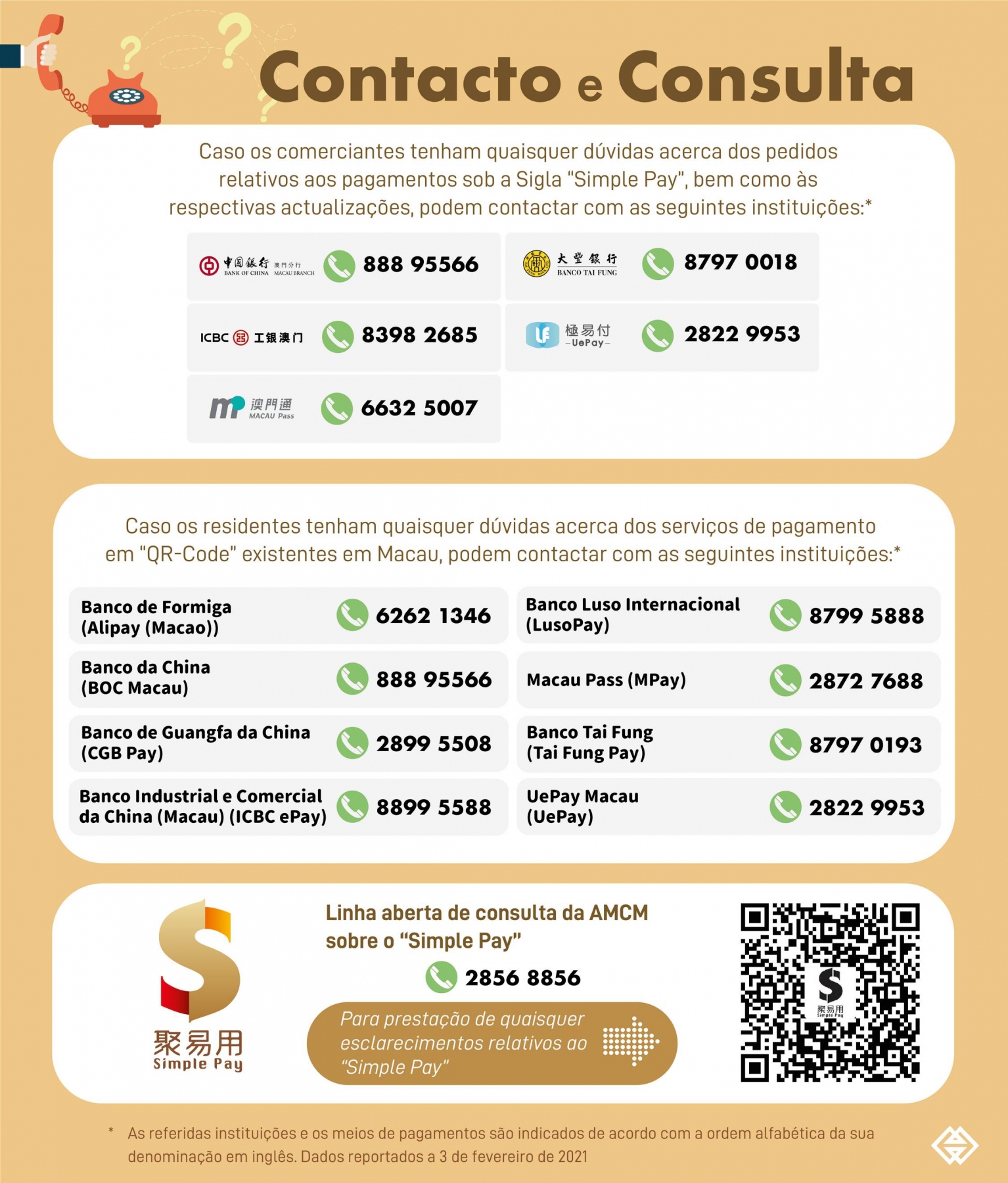 A AMCM solicitou às instituições financeiras a mobilização adequada dos próprios recursos, de modo a permitir que os serviços de apoio sejam bem prestados aos clientes, bem como apela aos residentes para escolherem o meio de pagamento adequado, aquando da realização de pagamento. Por sua vez, as instituições financeiras divulgarão, em breve, os vídeos de apresentação de respectivas operações. Para a prestação de apoio, queiram por favor contactar as instituições financeiras que disponibilizam este serviço, ou consultar a página electrónica temática do serviço de pagamento agregado sob a sigla “Simple pay” (https://www.amcm.gov.mo/zh/news-and-announcements/simplepay/contact). Para mais informações sobre o “Plano de benefícios do consumo por meio electrónico”, queiram consultar a página exclusiva deste programa (http://www.dsedt.gov.mo/2021consumo), ou solicitar informações, durante o horário de expediente (De 2.ª feira a 6.ª feira, entre as 9:00 horas e as 13:00 horas e entre as 14:30 horas e as 17:45 horas), através dos seguintes meios: