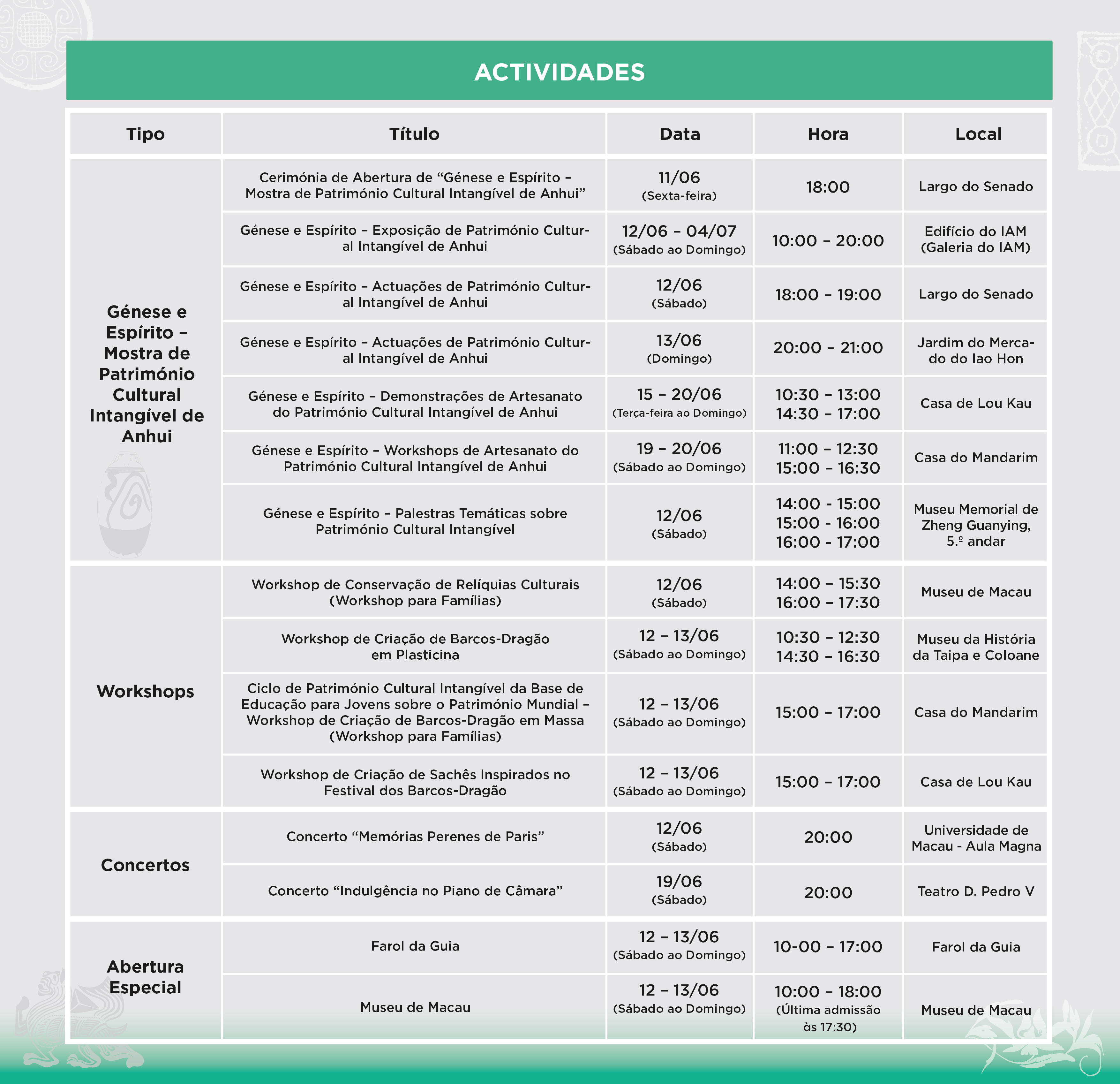 O evento de destaque desta edição do “Dia do Património Cultural e Natural”, “Génese e Espírito – Mostra de Património Cultural Intangível de Anhui”, foi apresentado pelo Ministério da Cultura e Turismo da República Popular da China e pela Secretaria para os Assuntos Sociais e Cultura do Governo da Região Administrativa Especial de Macau, organizado pelo Instituto Cultural do Governo da RAEM e pelo Departamento de Cultura e Turismo da Província de Anhui e co-organizado pelo Departamento de Propaganda e Cultura do Gabinete de Ligação do Governo Popular Central na RAEM, pelo Centro de Protecção do Património Cultural Intangível da Província de Anhui e pela Base de Ensino e Formação em Turismo para a Grande Baía Guangdong-Hong Kong-Macau. O evento será realizado de 12 de Junho a 4 de Julho, com vista a apresentar aos residentes de Macau uma gama diversificada de elementos do património cultural intangível da Província de Anhui, através de um programa imperdível de actividades, incluindo exposições, actuações culturais e artísticas, palestras temáticas, bem como demonstrações e workshops de artesanato.
