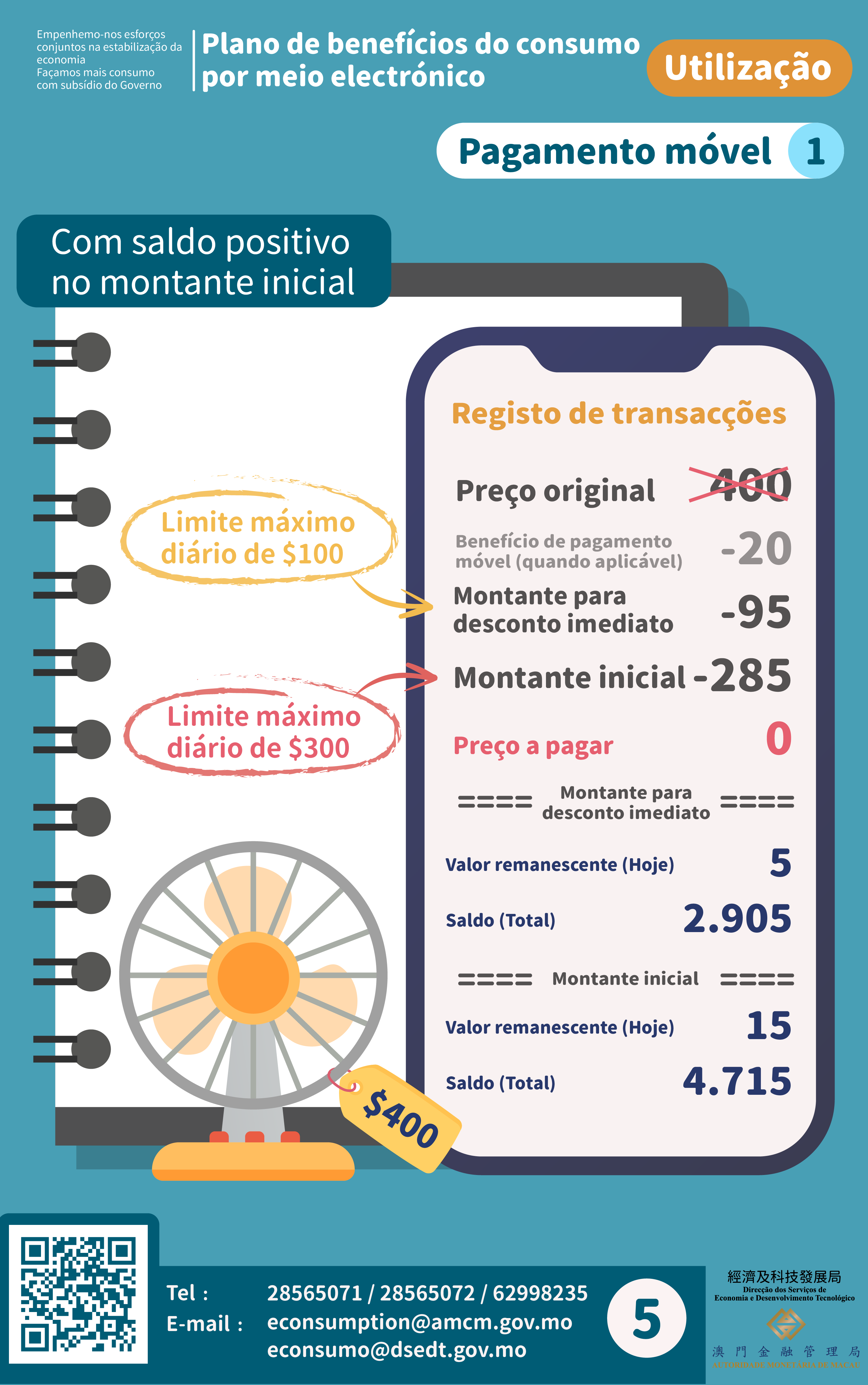 Os “benefícios de consumo por meio electrónico” dividem-se em duas partes: “montante inicial”, no valor de 5 000 patacas; e, “desconto imediato”, no valor de 3 000 patacas. Ambos devem ser utilizados conjuntamente. E ao consumir, 25% do valor da transacção (ou seja desconto de 25%) será deduzido no montante do “desconto imediato”, e o restante 75% será deduzido no “montante inicial”.
