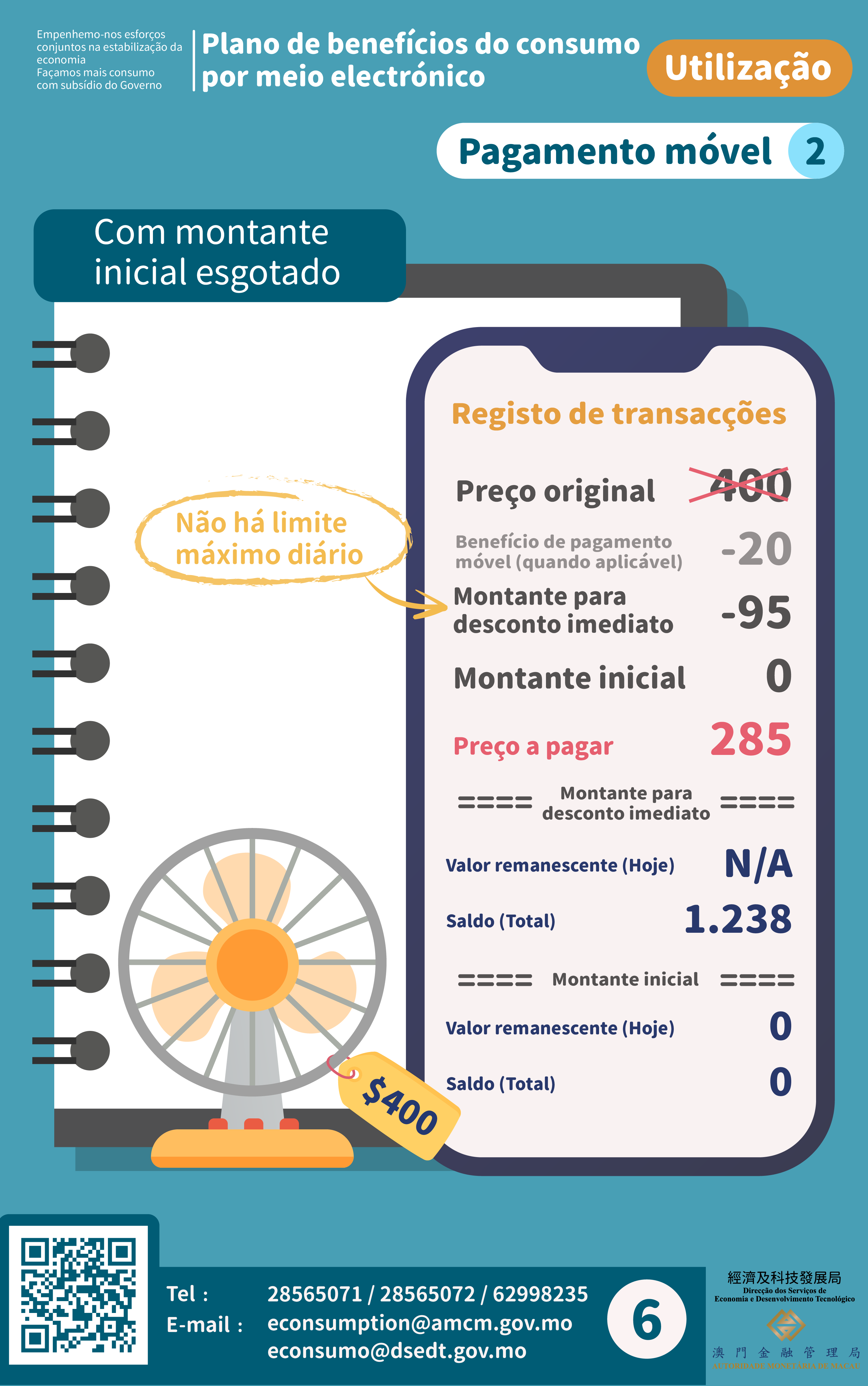Após esgotado o “montante inicial” de 5 000 patacas e, tendo ainda saldos no “montante para desconto imediato”, os residentes podem, por iniciativa própria, proceder ao carregamento de dinheiro para que possam continuar a beneficiar de descontos de 25%, deixando de vigorar, nessa altura, o limite máximo diário anteriormente estipulado, aquando da utilização desse dinheiro, até que o montante para desconto imediato seja totalmente usado.