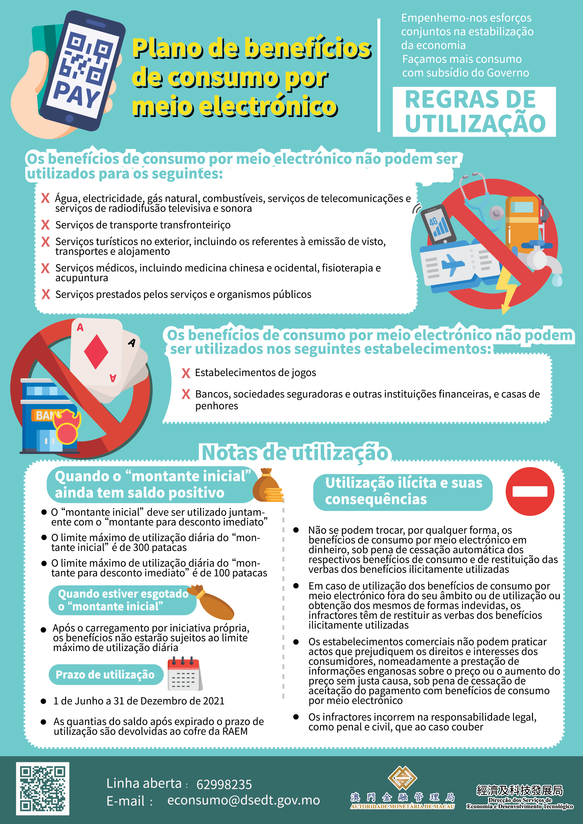 Nos termos do Regulamento Administrativo n.º 15/2021 (“Plano de benefícios de consumo por meio electrónico”), os comerciantes não podem aceitar, de forma ilícita, o pagamento com subsídio de consumo, nem praticar actos que prejudiquem os direitos e interesses dos consumidores, nomeadamente a prestação de informações enganosas sobre o preço ou o aumento do preço sem justa causa, devendo ainda os mesmos prestar plena cooperação.