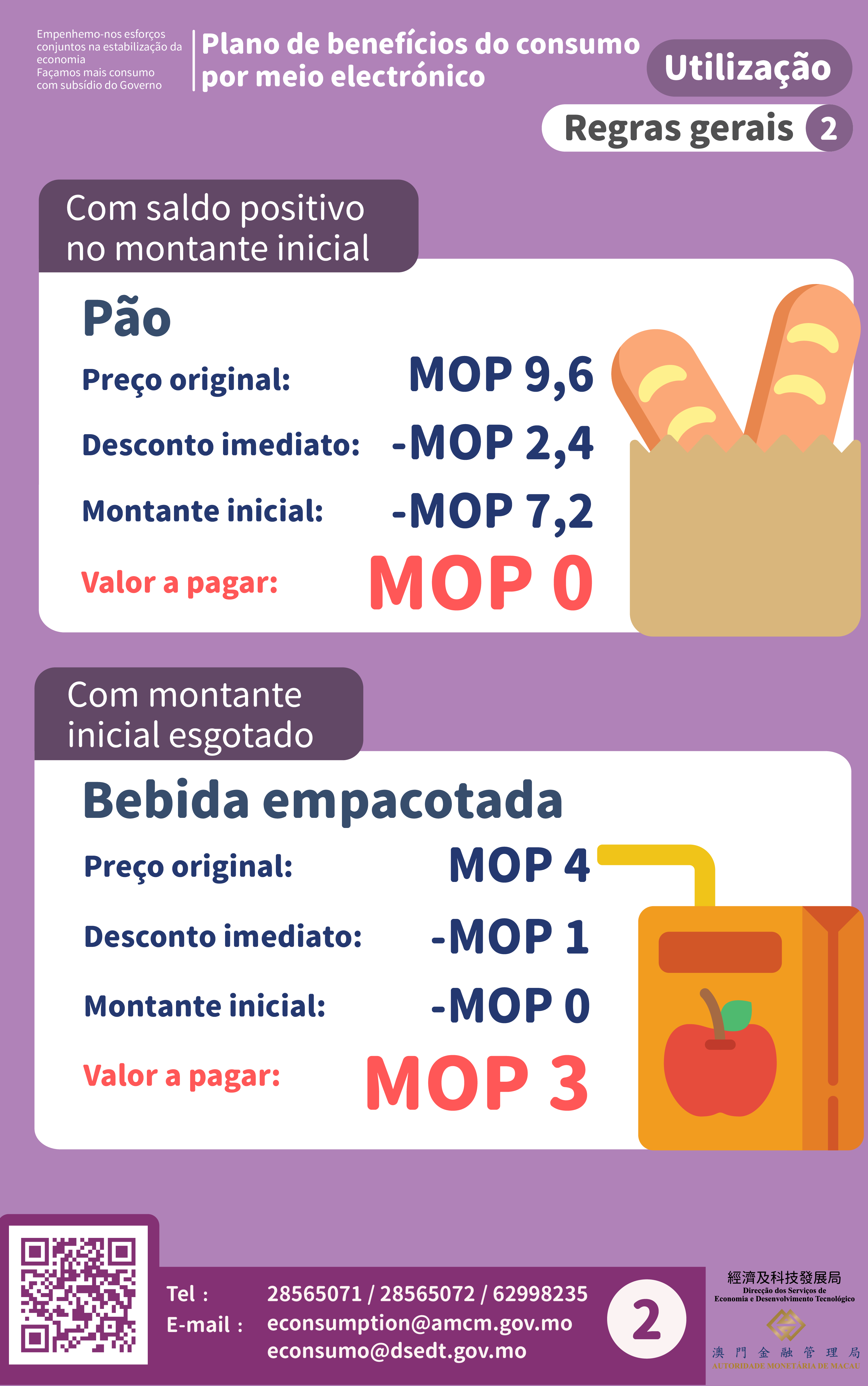 Não está fixado o limite mínimo para o “montante inicial” e “desconto imediato”, beneficiando também consumos em pequenos valores. A título exemplificativo, comprar um pacote de chá de limão que custa 4 patacas com o pacote de benefícios. Das quais, 1 pataca vai ser deduzida no “desconto imediato” e 3 patacas no “montante inicial”, não havendo necessidade de pagamento adicional por parte dos residentes.