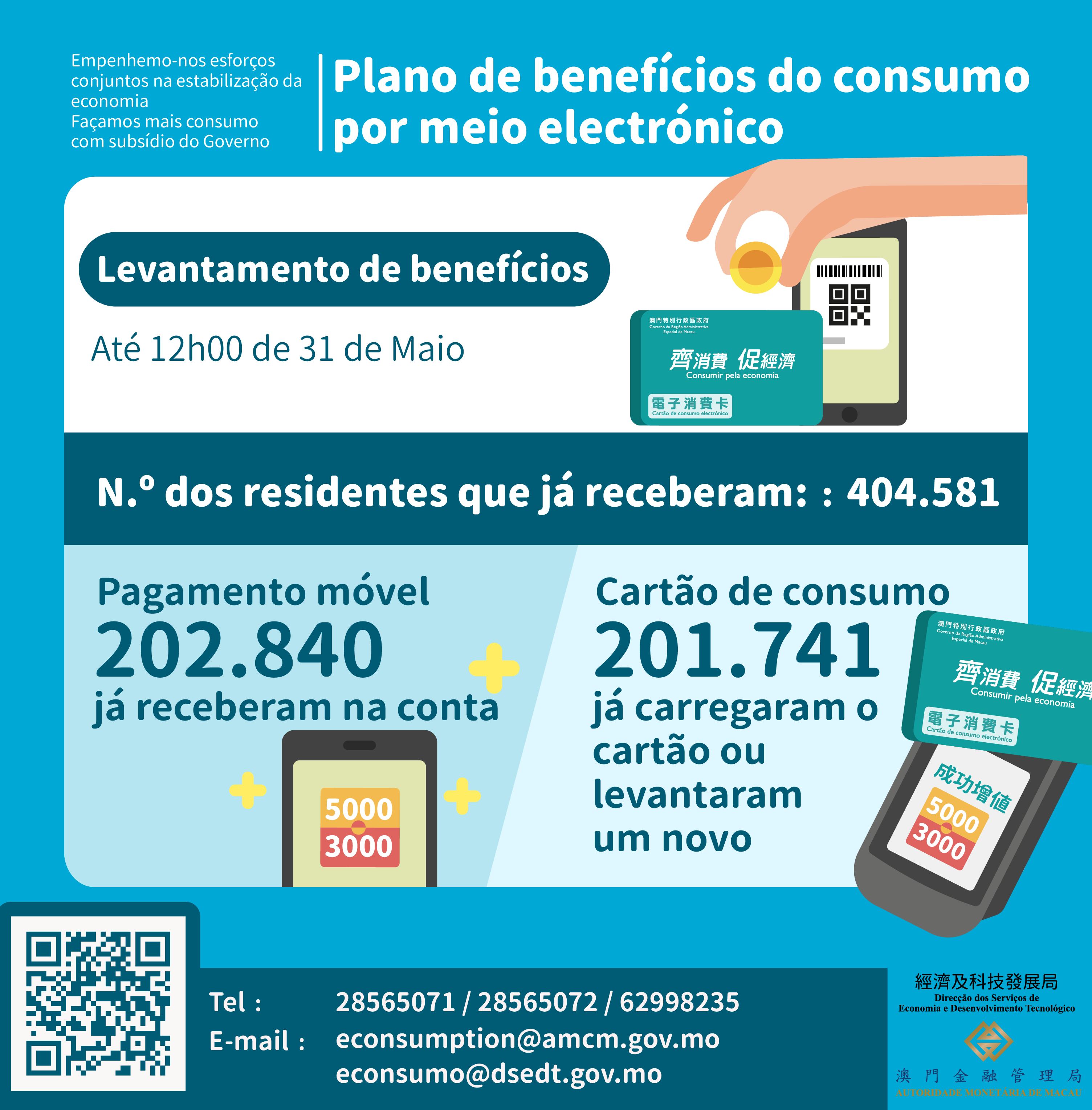 Até 12H00 de hoje (dia 31), 405 mil residentes já receberam os benefícios. De entre estes residentes, cerca de 202 já concluíram o carregamento do cartão de consumo ou já levantaram o novo cartão. Além disso, os cerca de 203 mil residentes já receberam praticamente os benefícios referente ao “pagamento móvel” através da transferência automática.