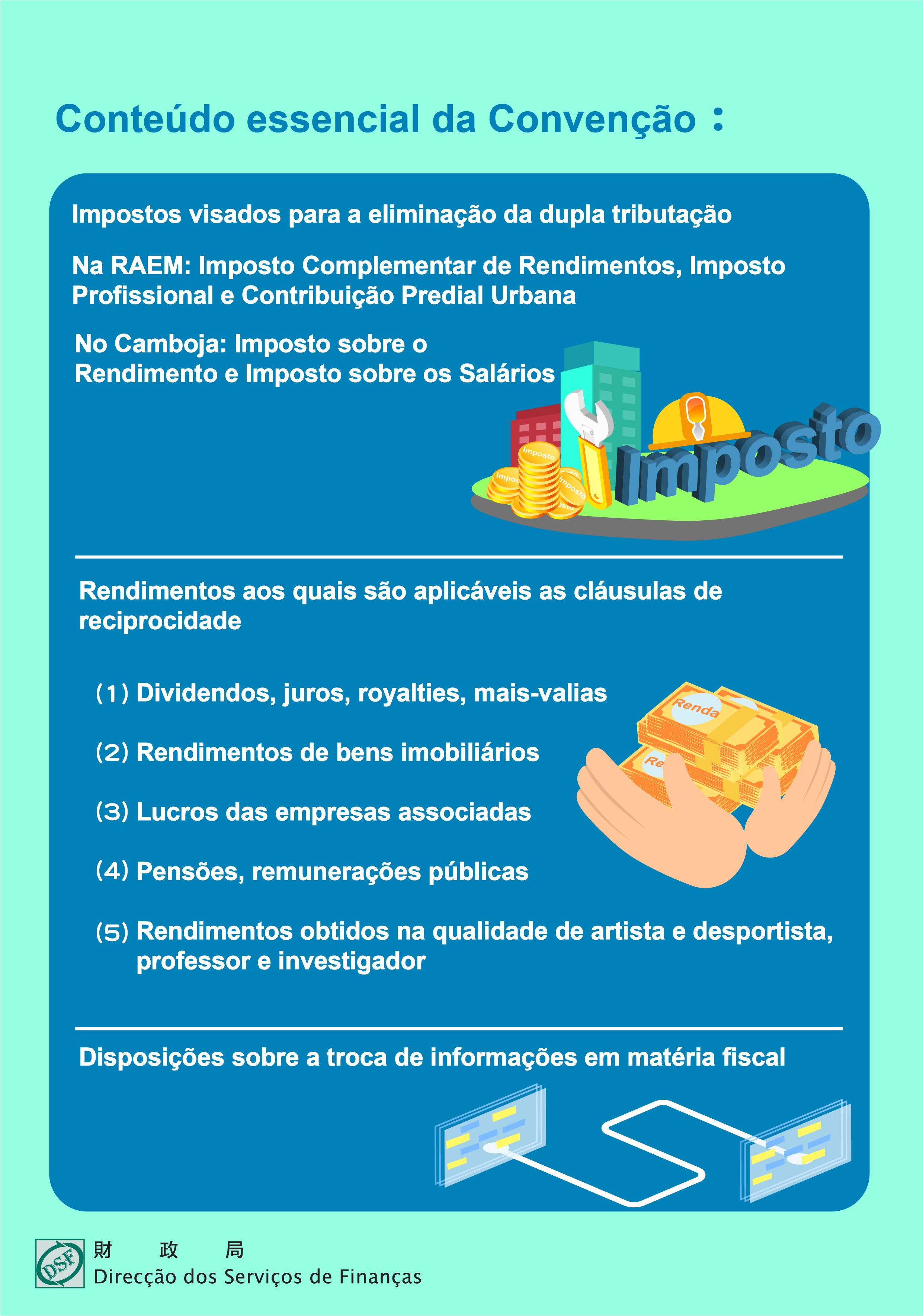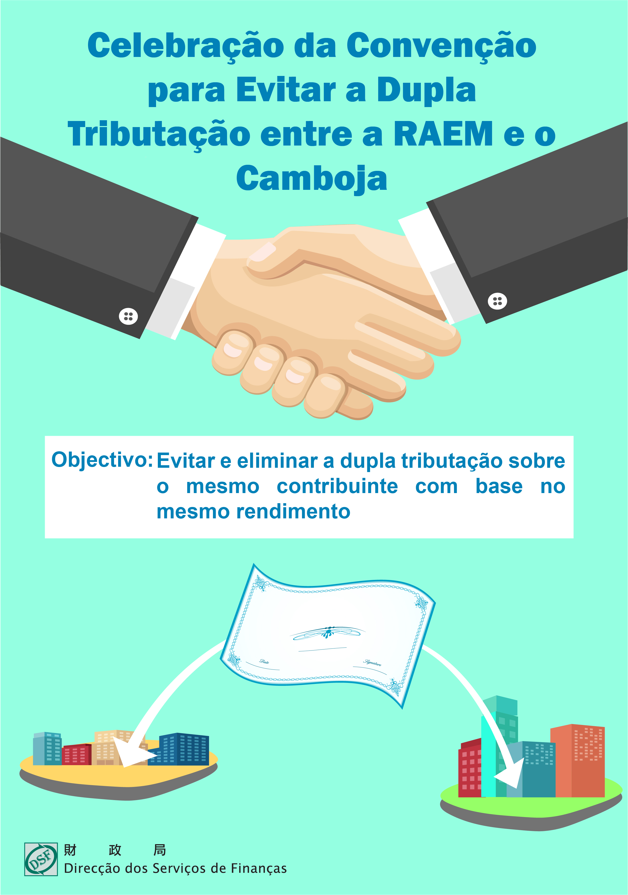 A RAEM assinou com outras jurisdições fiscais Convenções para eliminar a dupla tributação, em conformidade com os princípios da igualdade e do benefício mútuo, cujo objectivo é evitar e eliminar que a mesma base de rendimento auferido pelo mesmo contribuinte seja tributada duplamente. O âmbito de aplicação da presente “Convenção” visa o imposto complementar de rendimentos, o imposto profissional e a contribuição predial urbana na RAEM, bem como o imposto sobre o rendimento e o imposto sobre os salários no Camboja.