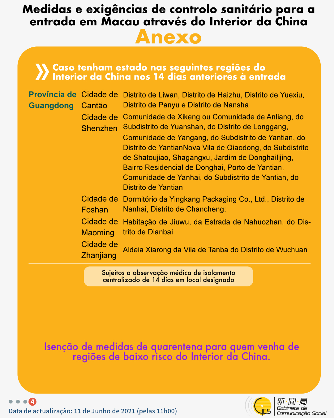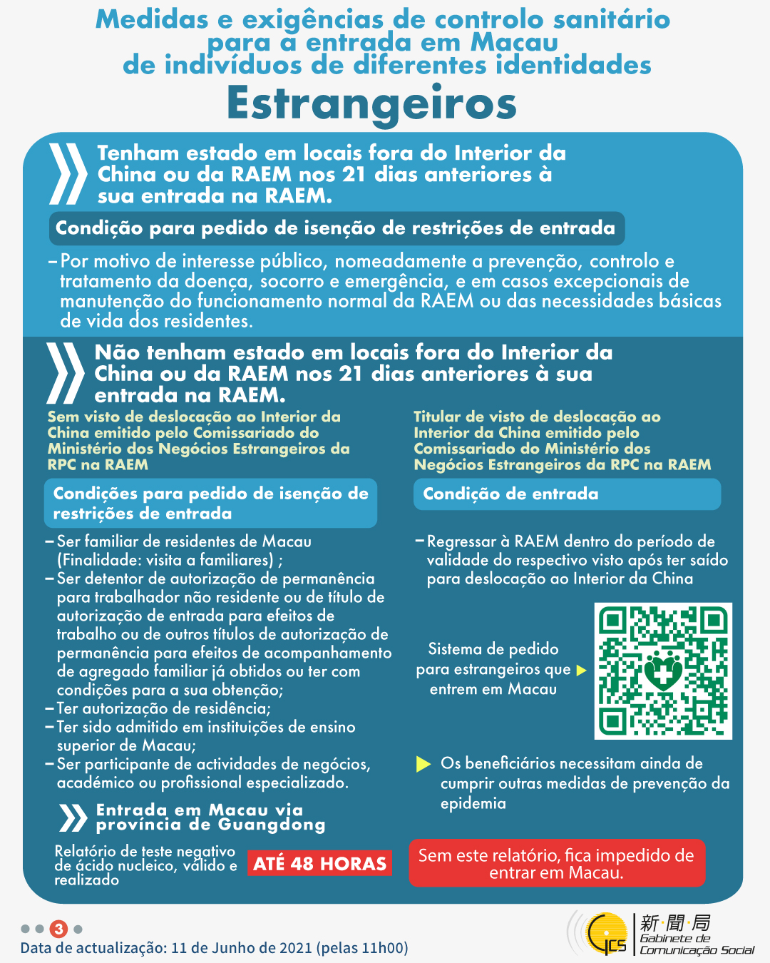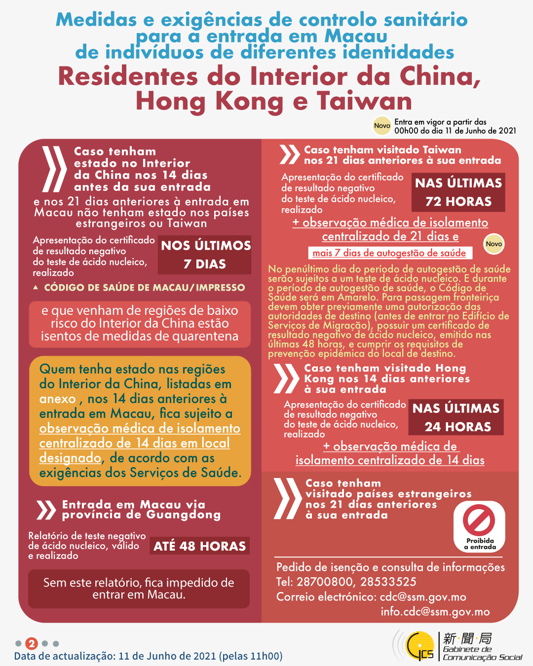 (Infografia)Medidas e exigências de controlo sanitário para a entrada em Macau de indivíduos de diferentes identidades, actualizadas no dia 11 de Junho de 2021