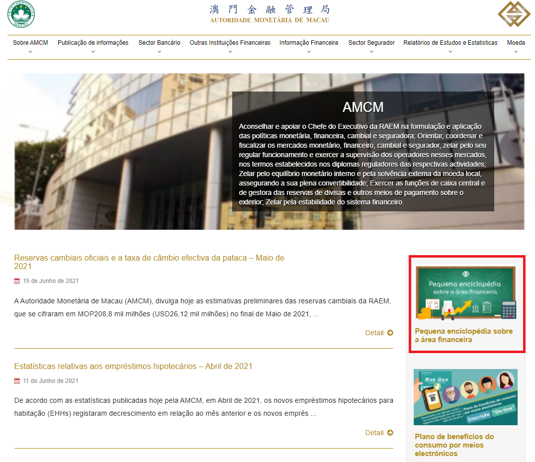 Na primeira fase, os vídeos dos “Conhecimentos financeiros” consistem em temas sobre “Obrigações”, “Fundos públicos e Fundos de oferta privada”, “Fundo soberano”, “Gestão de fortunas” e “Acções”, os quais foram disponibilizados na coluna específica de “Pequena enciclopédia sobre a área financeira” na página electrónica da AMCM (https:// https://www.amcm.gov.mo/pt/news-and-announcements/cyclopedia).