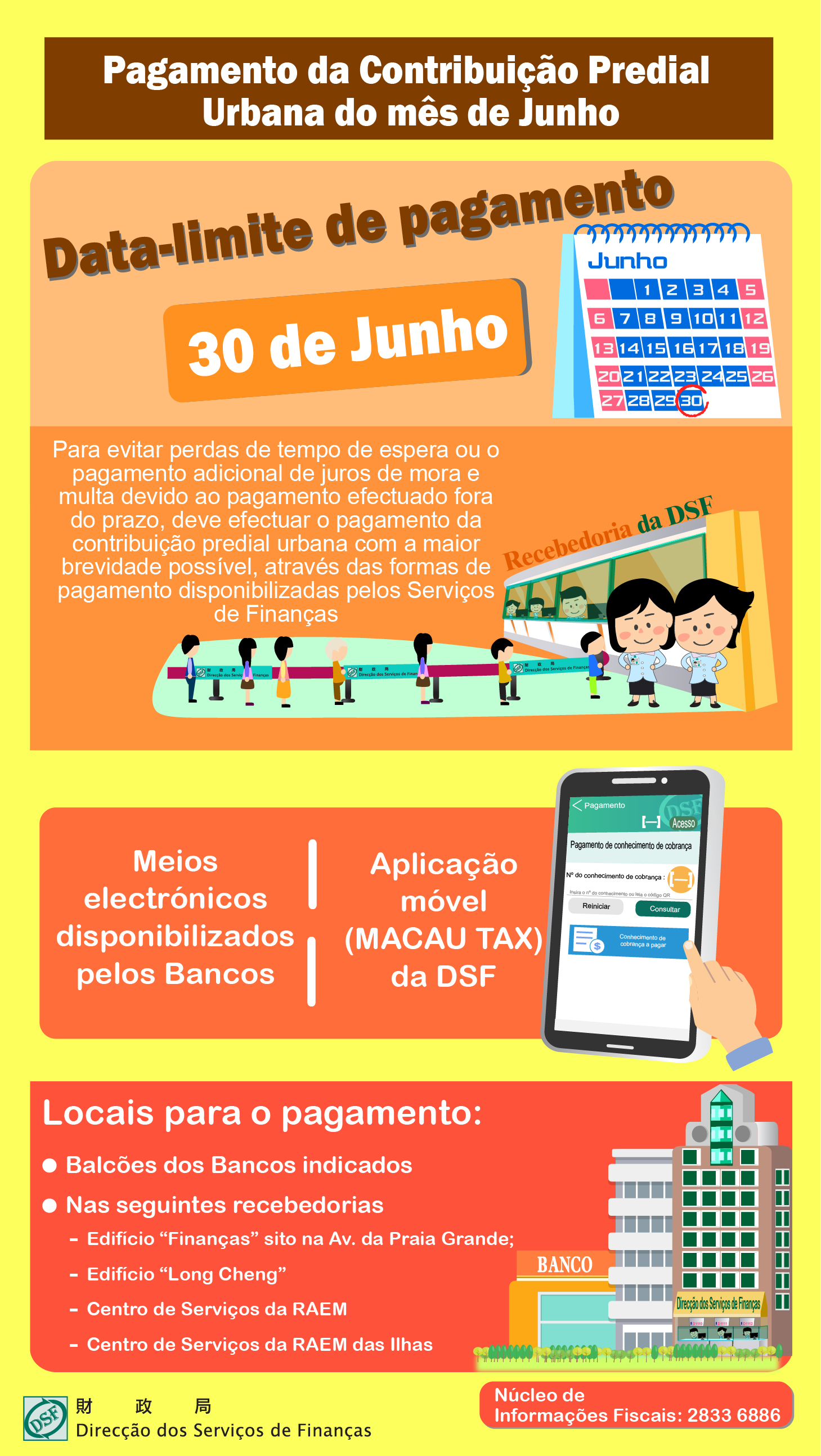 A Direcção dos Serviços de Finanças vem lembrar os contribuintes que receberam conhecimentos de cobrança da Contribuição Predial Urbana, respeitantes ao ano de 2020, com indicação do prazo de pagamento em Junho, que o respectivo prazo limite termina no próximo dia 30 de Junho. Para evitar perdas de tempo de espera ou o pagamento adicional de juros de mora e multa, devido ao pagamento fora do prazo, esta Direcção de Serviços apela aos contribuintes que ainda não o fizeram para efectuarem o respectivo pagamento com a maior brevidade possível, por meio das formas de pagamento disponibilizadas pelos Serviços de Finanças, podendo ainda fazê-lo dentro das horas de expediente, nos balcões dos Bancos indicados ou por sua transacção electrónica, além disso, utilize a aplicação móvel (MACAU TAX) da DSF para digitalizar o QRcode do conhecimento de cobrança, para ligar-se à plataforma de pagamento móvel, e efectuar o pagamento do imposto ou nas Recebedorias instaladas, respectivamente, no Edifício “Finanças”, no Edifício “Long Cheng”, no Centro de Serviços da RAEM e no Centro de Serviços da RAEM das Ilhas. Por forma a facilitar o pagamento, os contribuintes podem, com a utilização do respectivo Bilhete de Identidade de Residente da RAEM, imprimir nos diversos quiosques os dados sumários do conhecimento de cobrança, a fim de efectuarem o pagamento nas máquinas ATM e através do banco por transacção electrónica, ou, imprimir a 2.ª via do conhecimento de cobrança, apenas disponível nos quiosques da DSF.