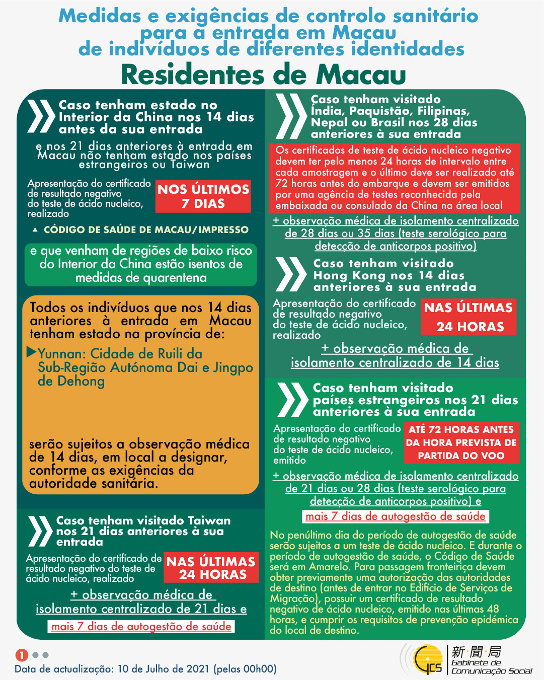(Infografia)Medidas e exigências de controlo sanitário para a entrada em Macau de indivíduos de diferentes identidades, actualizadas no dia 10 de Julho de 2021