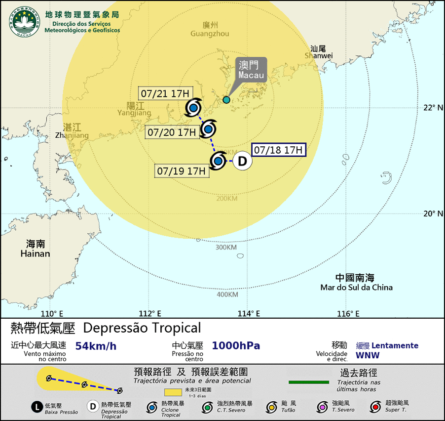 A área de baixa pressão localizada na parte norte do Mar do Sul da China desenvolveu-se para uma depressão tropical. A dimensão desta depressão tropical é relativamente pequena, no entanto, esta mantêm-se a uma distância relativamente próxima do território, e pode ser voltar a intensificar-se. Espera-se que a circulação relacionada com o sistema traga tempo instável para Macau. Nos próximos dias, o vento na região vai intensificar-se, havendo aguaceiros fortes. Esta Direcção continua a acompanhar os desenvolvimentos. Por outro lado, nos dias 19 e 20, apesar de Macau não estar de momento influenciado por marés astronómicas, a população deve ficar atenta à possibilidade de inundações causadas por chuvas fortes.