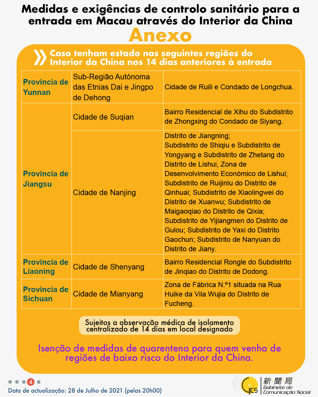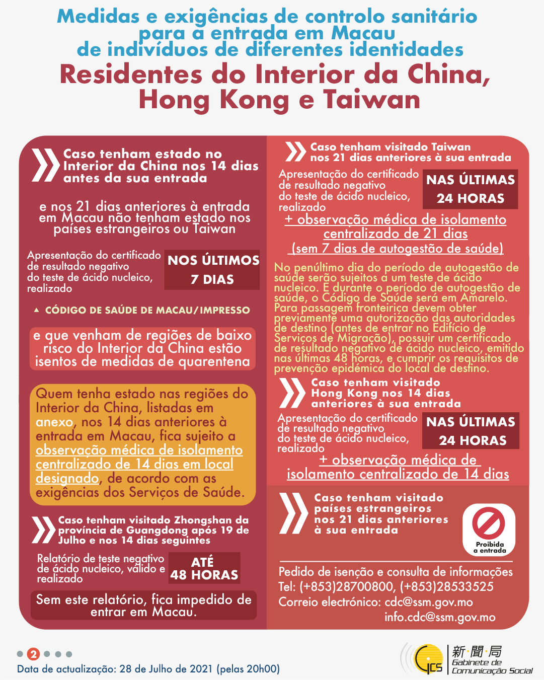 (Infografia)Medidas e exigências de controlo sanitário para a entrada em Macau de indivíduos de diferentes identidades, actualizadas no dia 28 de Julho de 2021