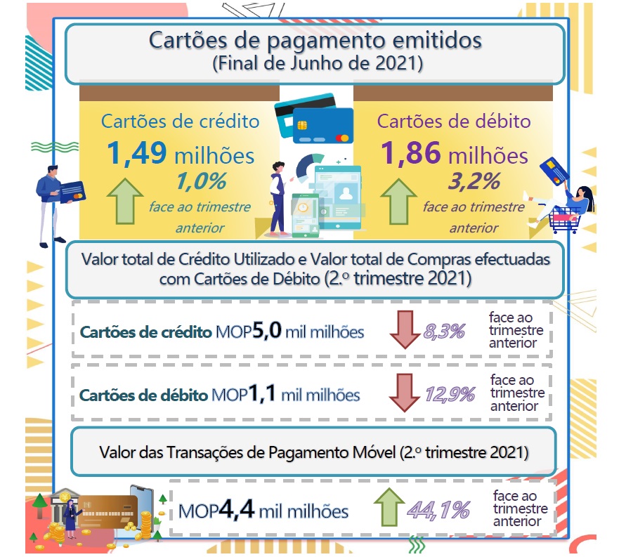 No segundo trimestre de 2021, o crédito utilizado no período atingiu MOP5,0 mil milhões, o que representa um decréscimo trimestral de 8,3%, mas verifica-se um crescimento anual de 9,0%. O adiantamento de numerário atingiu MOP156,7 milhões, correspondendo a 3,1% do total do crédito utilizado no período. O número de transações com cartões de crédito totalizou 6,9 milhões, o que representa uma redução trimestral de 1,7%. O montante do reembolso, incluindo os juros e despesas, foi de MOP5,2 mil milhões, o que representa uma diminuição de 9,8% relativamente ao trimestre anterior mas um crescimento de 13,8% relativamente ao período homólogo do ano transacto. Por outro lado, o número de transações com cartões de débito (não incluindo o levantamento de numerário) totalizou 548,0 mil, o que representa uma diminuição trimestral de 22,1%. O valor total de compras efectuadas com cartões de débito atingiu MOP1,1 mil milhões, correspondendo a uma descida de 12,9% relativamente ao trimestre anterior, mas um crescimento de 16,9% relativamente ao período homólogo do ano transacto.