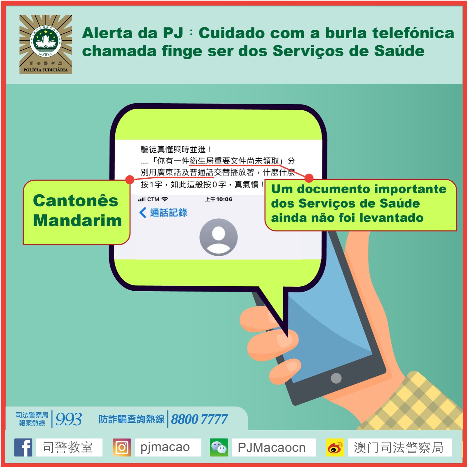 Recentemente, a PJ recebeu informações de um cidadão dizendo que recebeu uma chamada telefónica, através do seu telemóvel, com uma gravação de voz, em cantonês e mandarim, dizendo “um documento importante dos Serviços de Saúde ainda não foi levantado”. O mesmo cidadão suspeitou da chamada e desligou imediatamente, reportando seguidamente o facto à PJ.