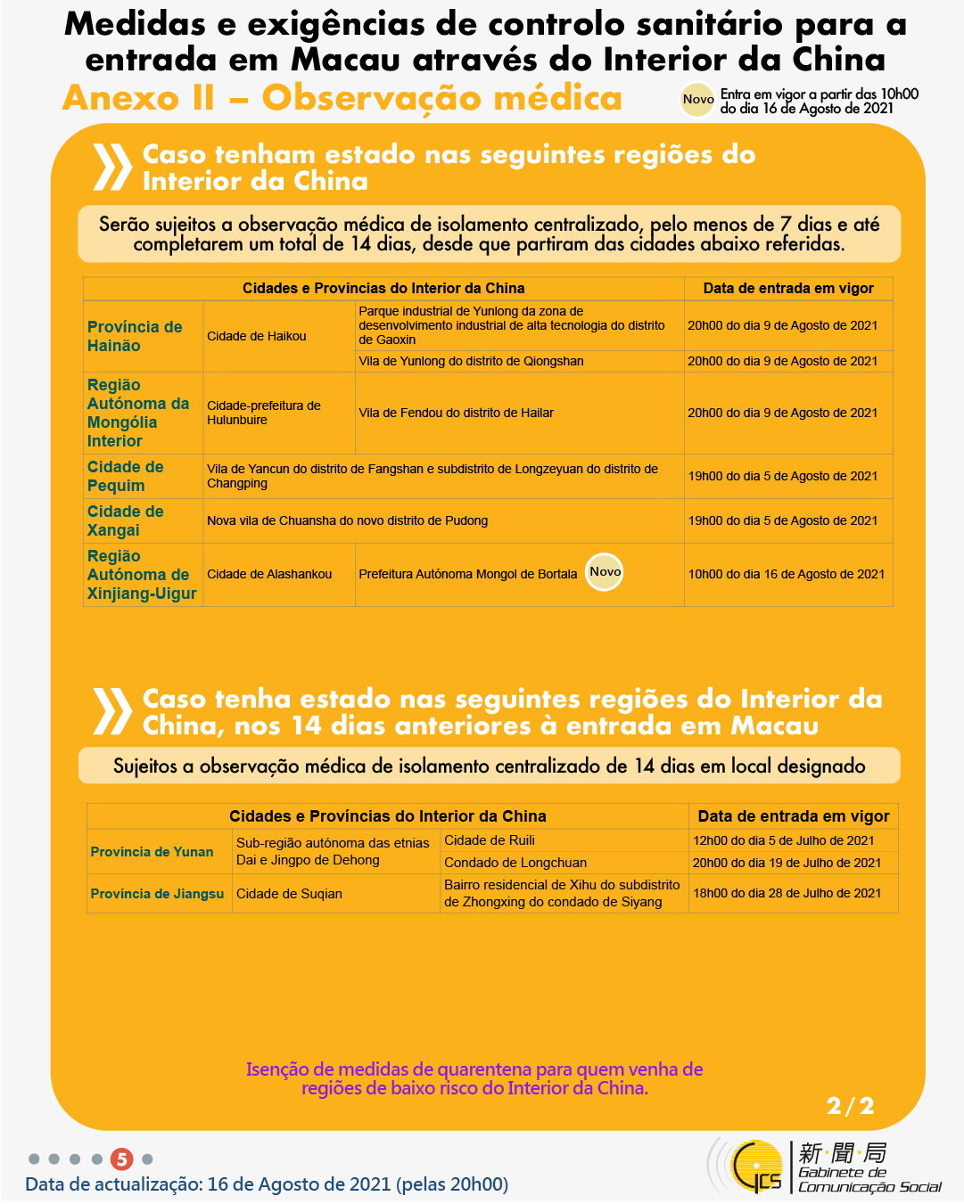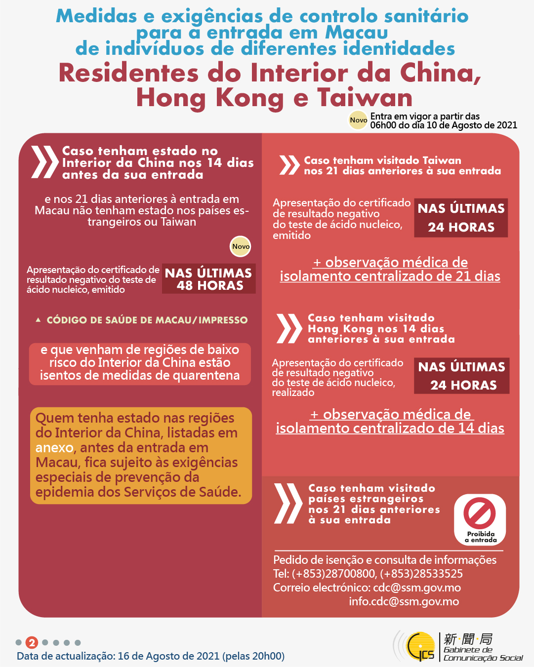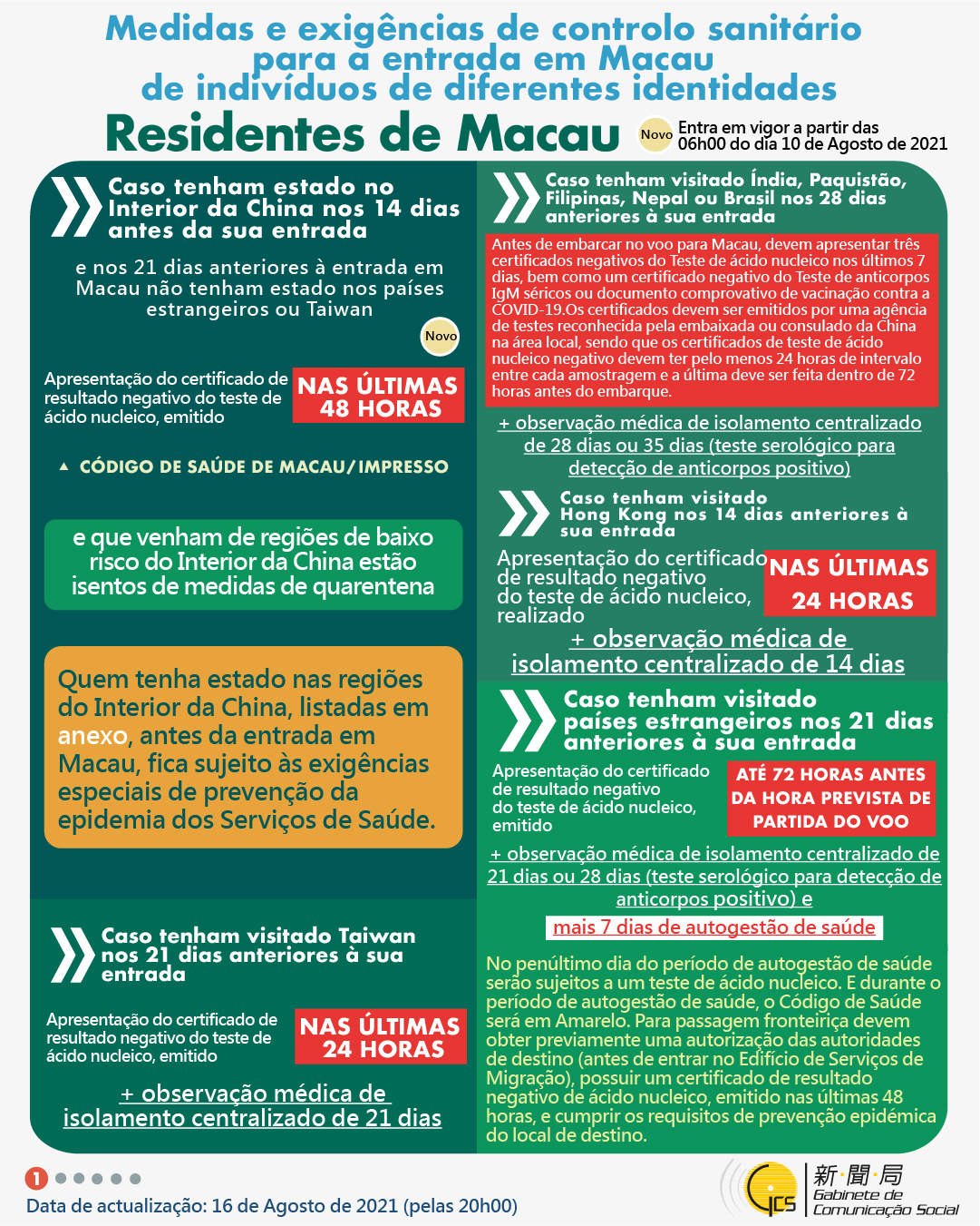 (Infografia)Medidas e exigências de controlo sanitário para a entrada em Macau de indivíduos de diferentes identidades, actualizadas no dia 16 de Agosto de 2021